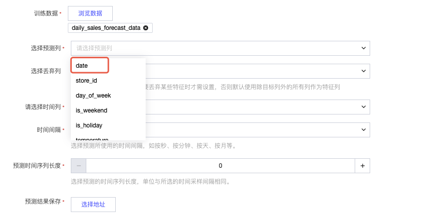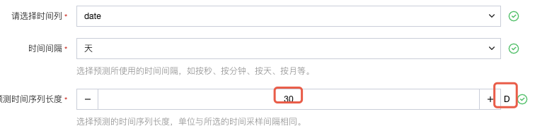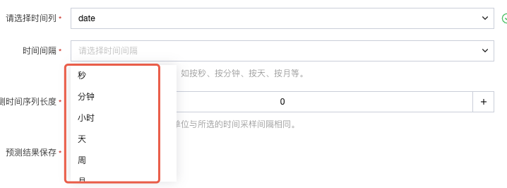 时间间隔:下拉选择数据的时间频率(如 “天”“小时”“月”,需与实际数据频率一致)。