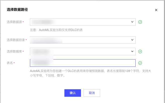 填写表名(限制 128 字符,支持字母、数字、下划线),系统将自动创建该表存储预测结果。