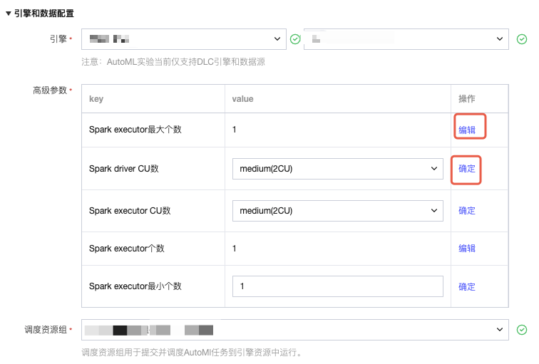 高级参数:可选,如需配置内核参数(如内存、CPU),单击 “编辑” 填写,填写后单击确定保存。