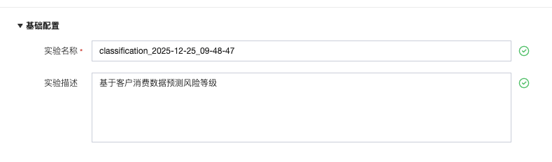 实验描述:可选,输入不超过 100 个字符的说明(如 “基于客户消费数据预测风险等级”)。