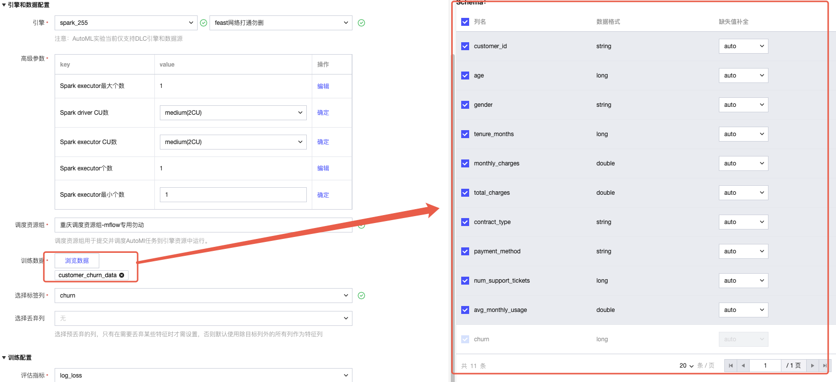 数据预览:选择后右侧将显示数据表结构(Schema),默认全选所有列。