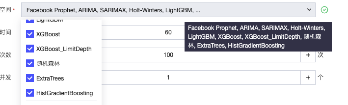 搜索空间:默认全选,可选 “Facebook Prophet”“ARIMA”“SARIMAX”“Deep-AR”“XGBoost” “LightGBM”“Holt-Winters”等