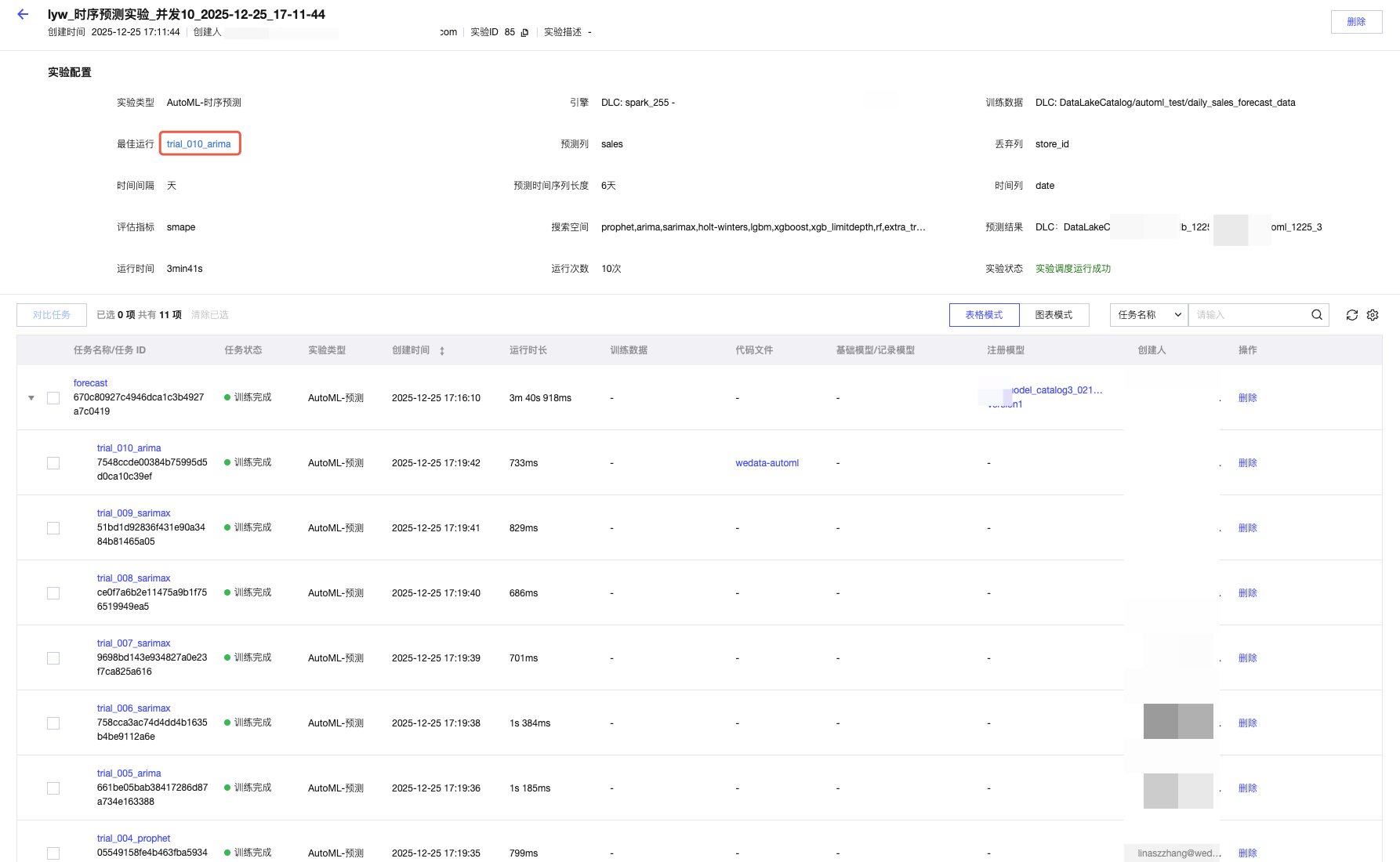 3. 查看详情:单击实验名称进入 “任务详情”,其中 “最佳运行” 字段显示最优模型,单击可查看该模型的参数、评估分数、生成的 Notebook 代码。