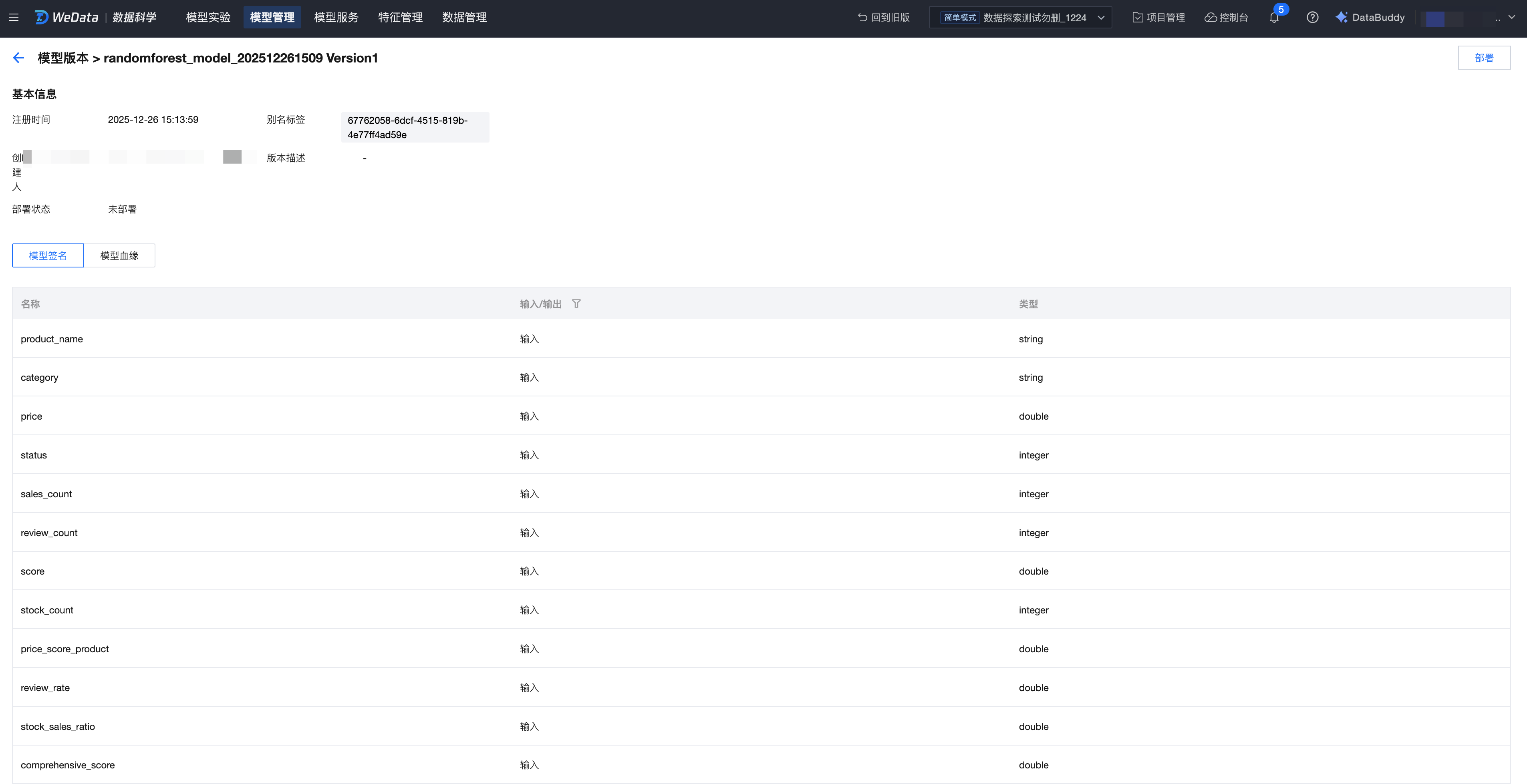 3. 单击模型版本,查看模型基本元数据、模型签名及血缘;支持修改模型别名标签、模型描述。