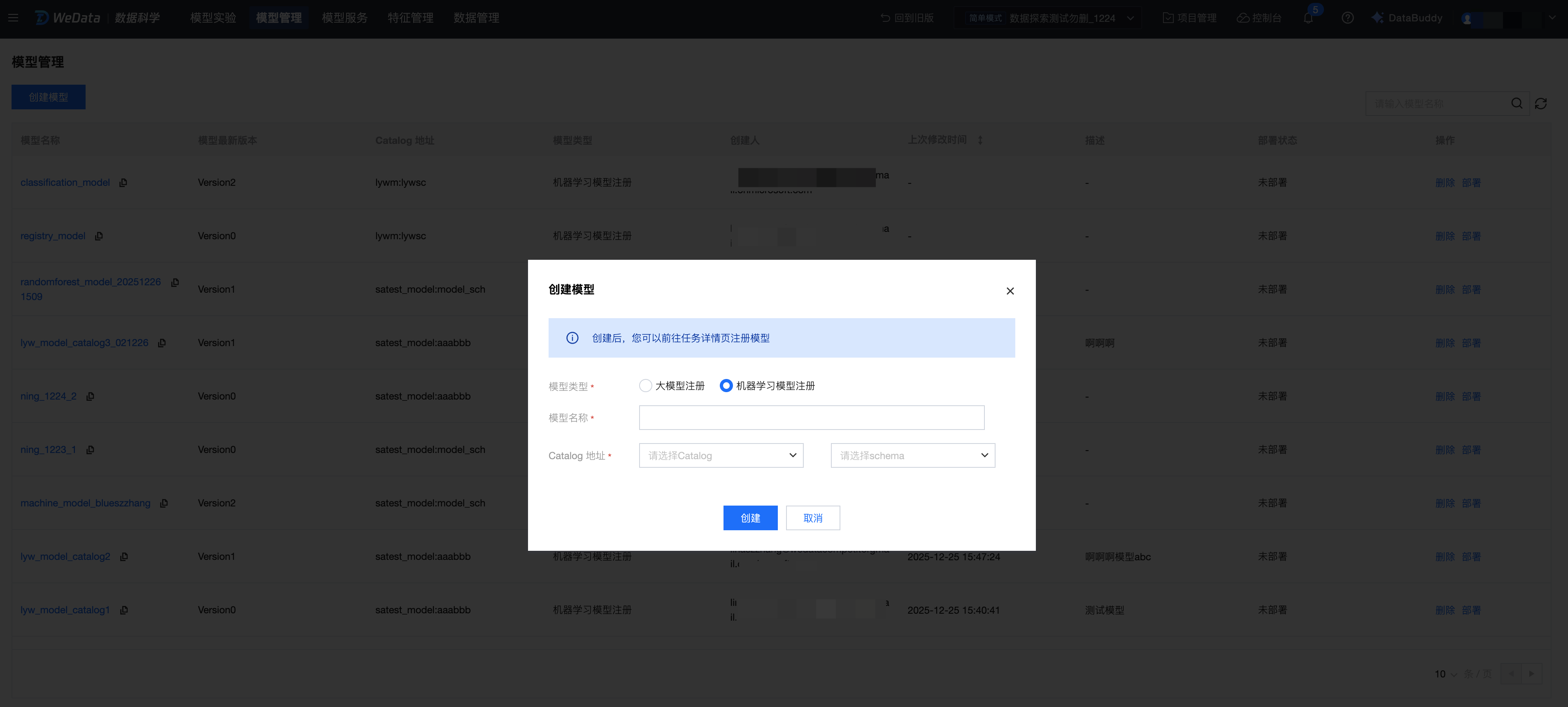 2. 单击创建模型,选择模型类型“机器学习模型注册”、填写模型名称、选择 catalog、schema 路径,单击创建;该步骤在 catalog 中创建了一个模型名称和路径。(说明:选择 catalog 地址的前提是需账号已有 catalog 数据目录的授权。)