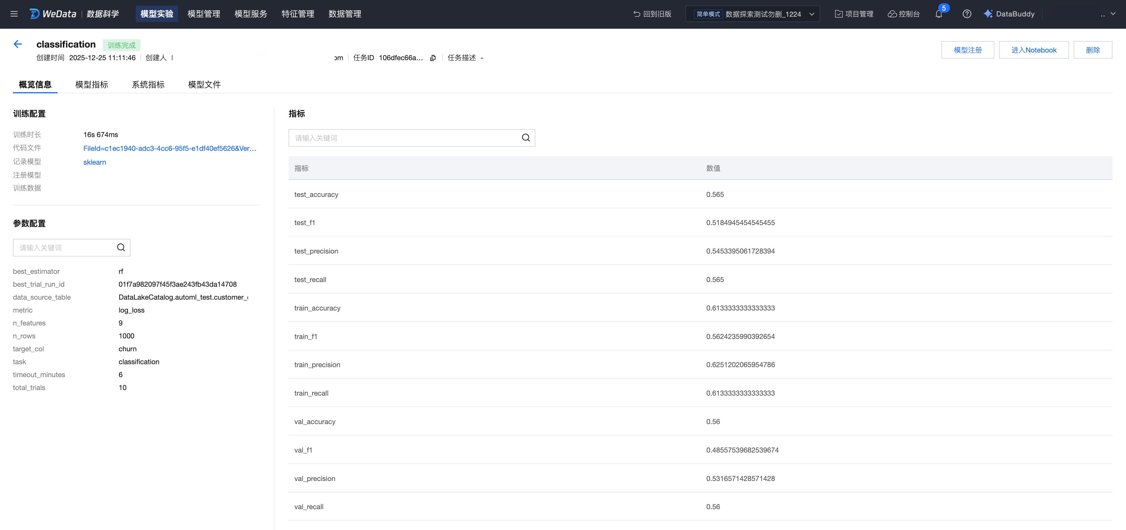 1. 左侧菜单进入实验管理,进入训练最佳的实验运行,单击模型注册。