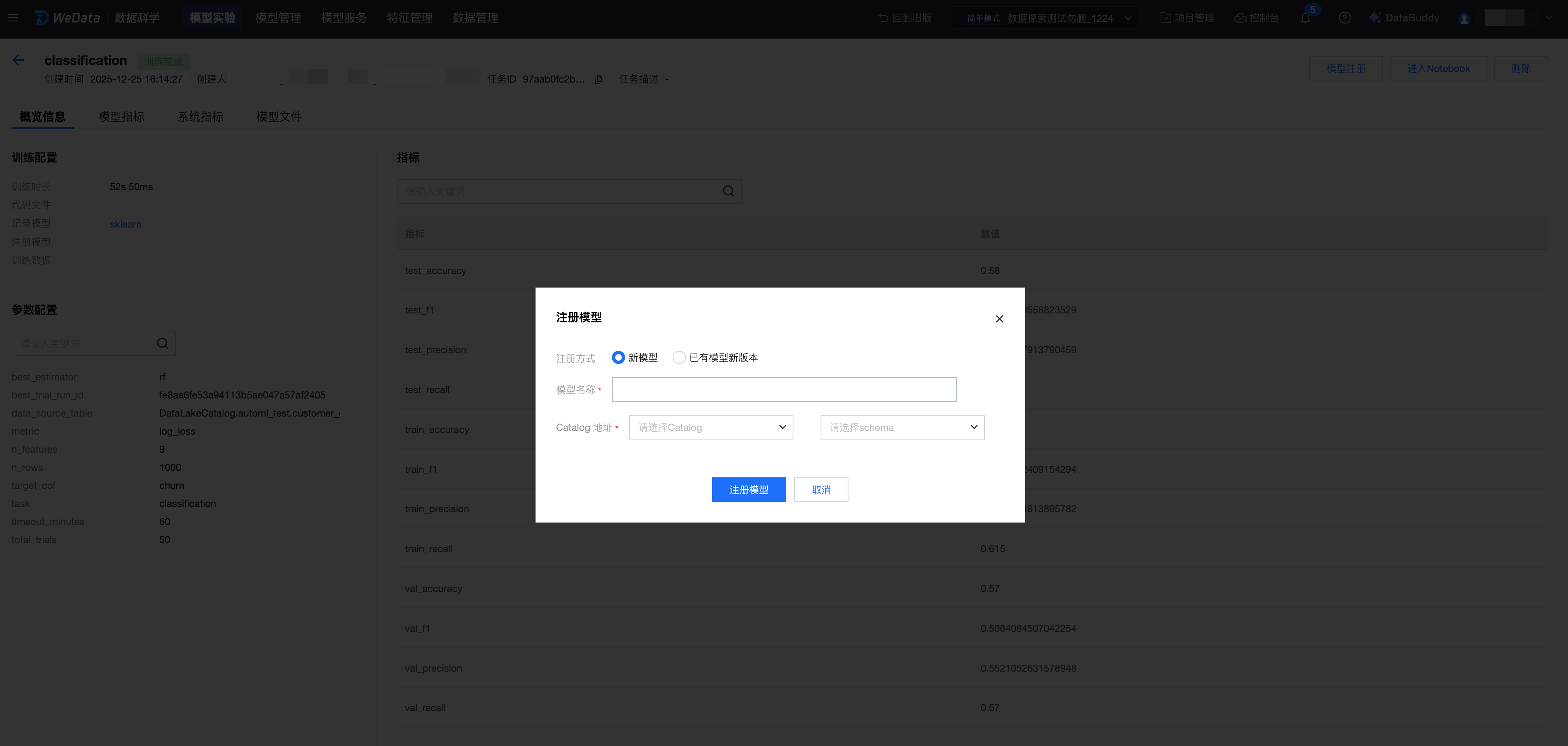 注册成新模型:输入模型名称、选择 catalog 和 schema,单击模型注册。(说明:选择 catalog 地址的前提是需账号已有 catalog 数据目录的授权。)