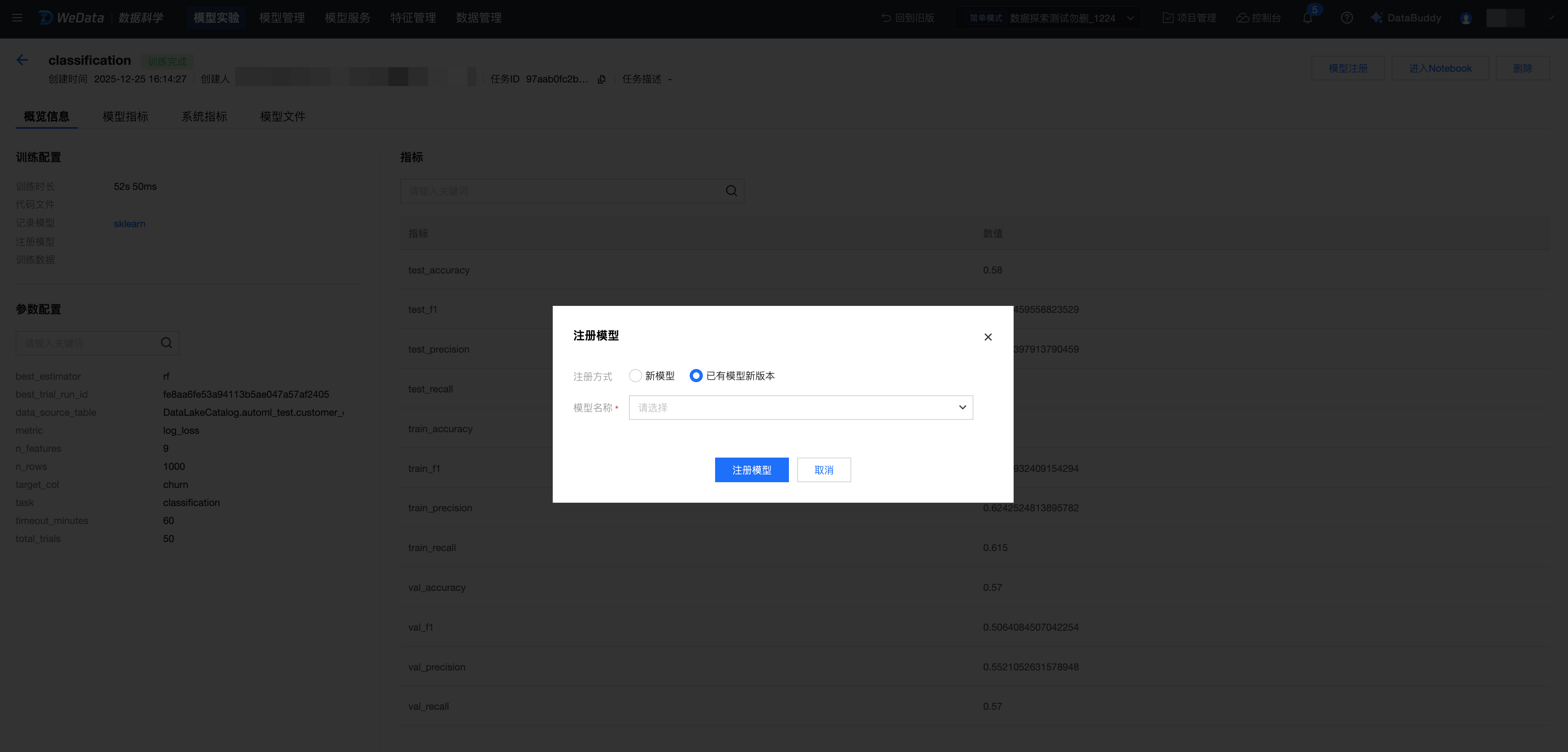 3. 到实验运行界面,基于具体的模型实验运行,单击模型注册,注册方式选择“已有模型新版本”,模型名称选择刚创建的模型名称。