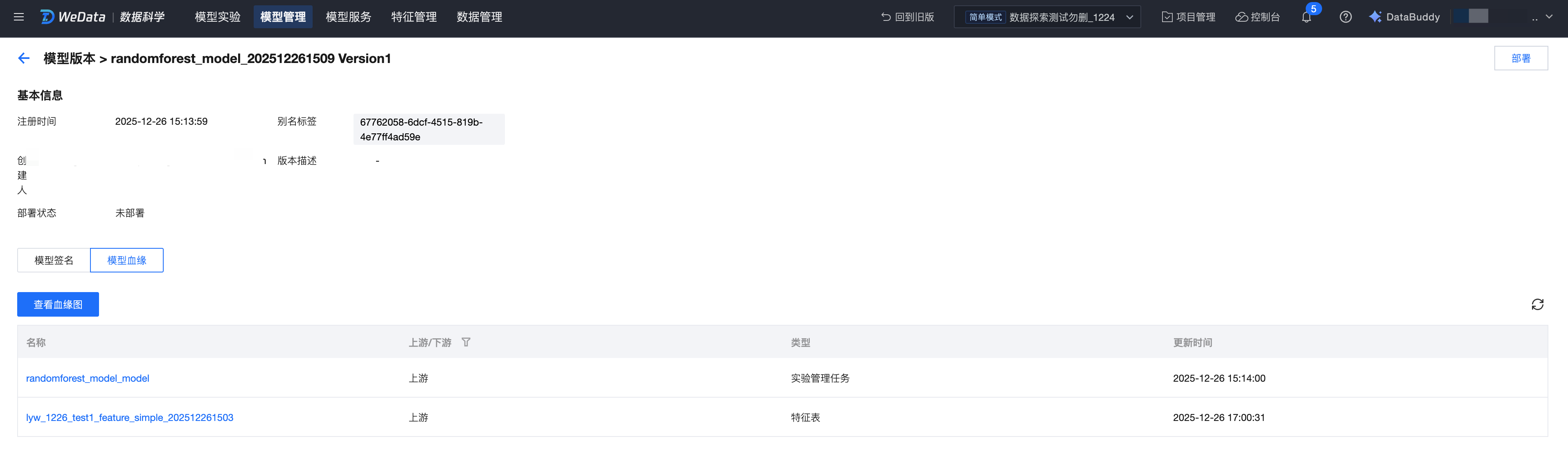 血缘追踪:展示模型与其上游数据、实验的关联,帮助你追踪模型的来源和依赖关系;