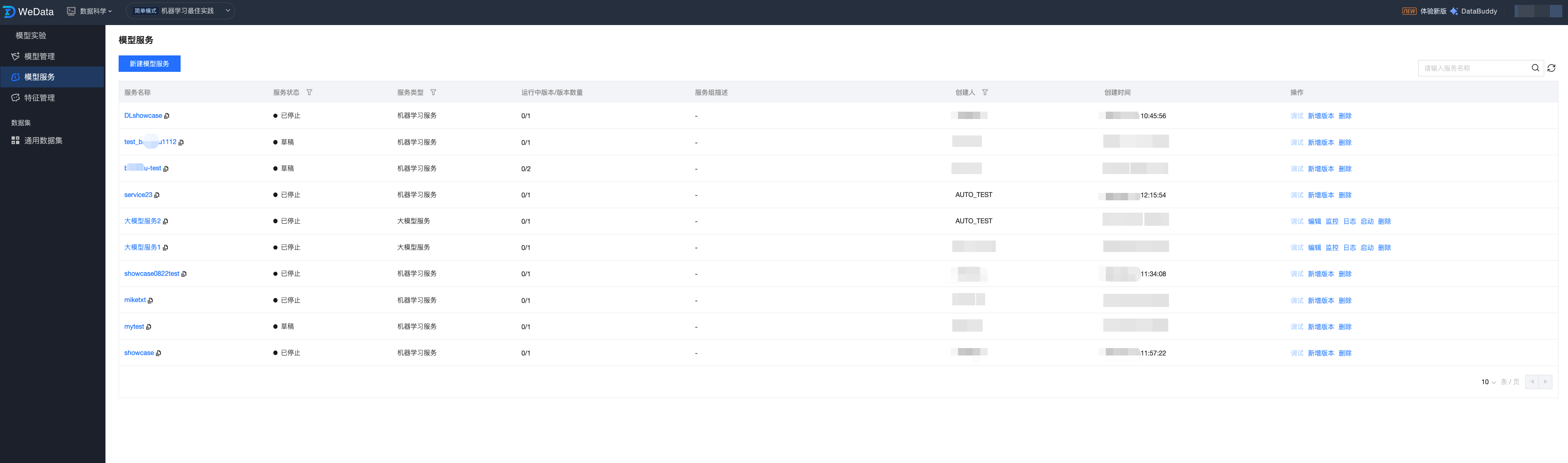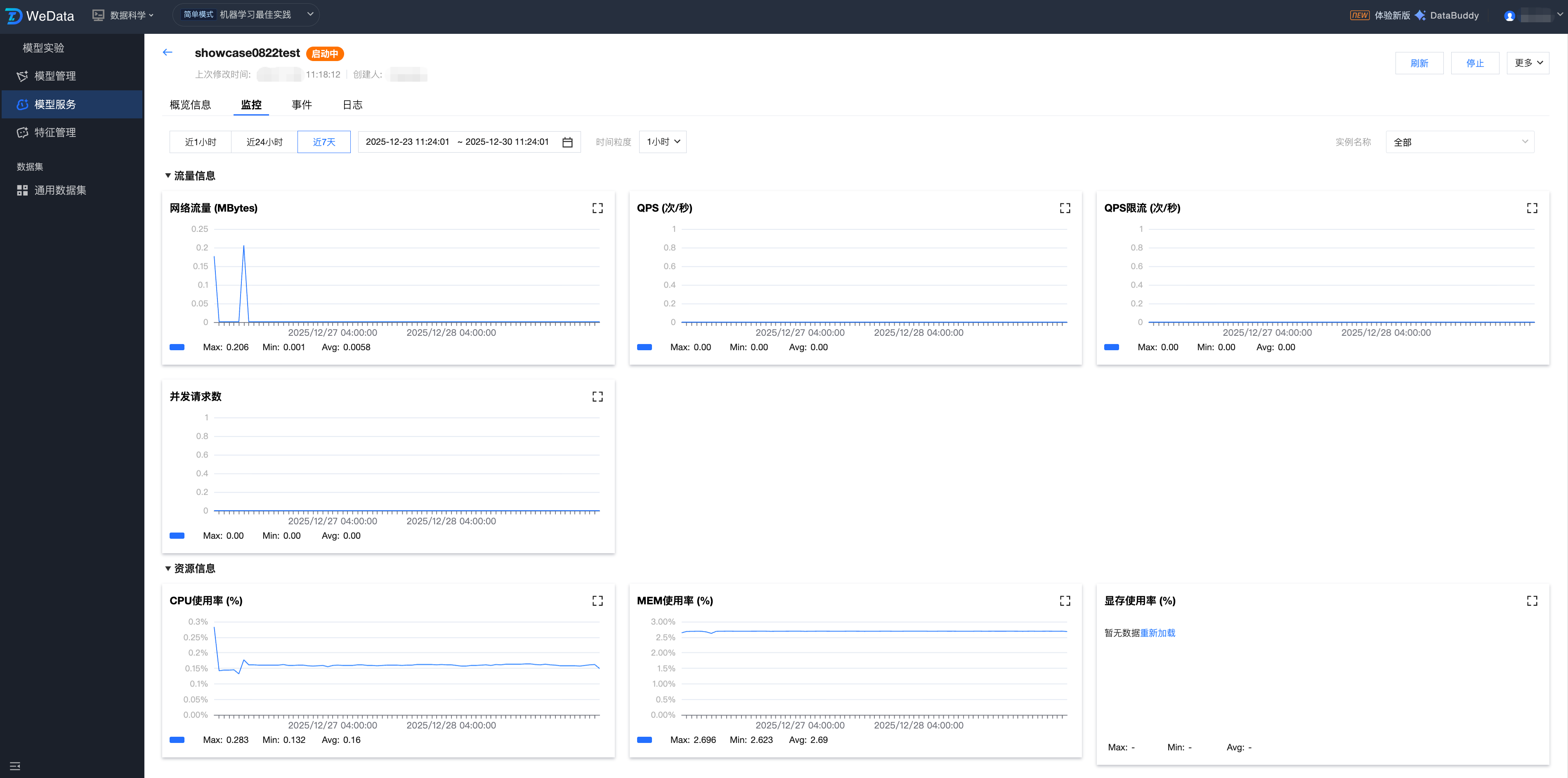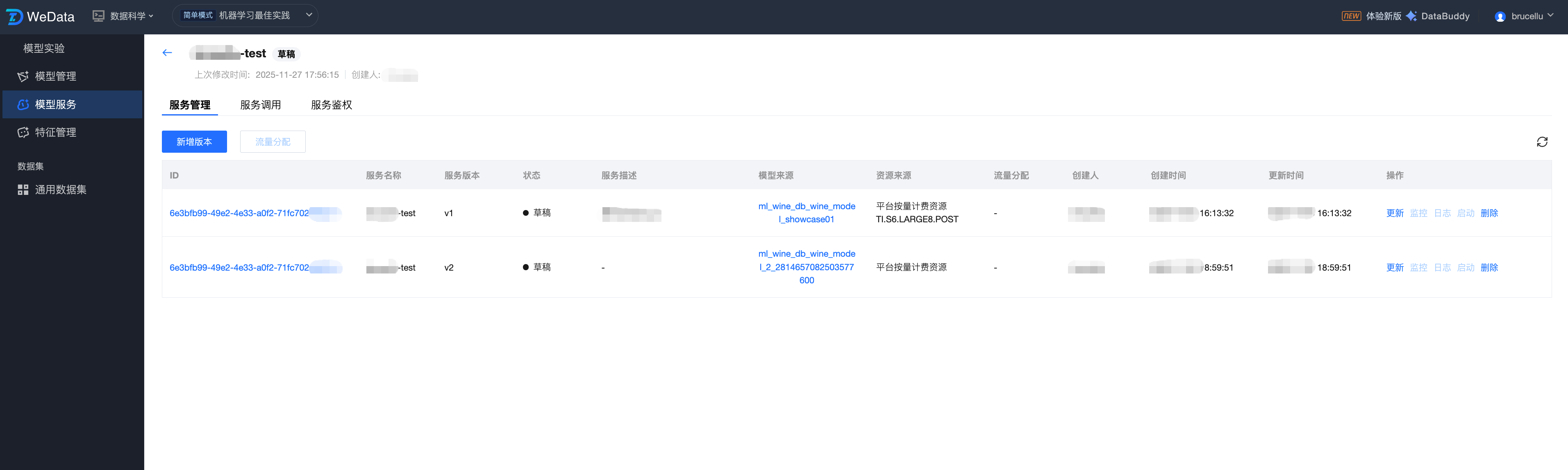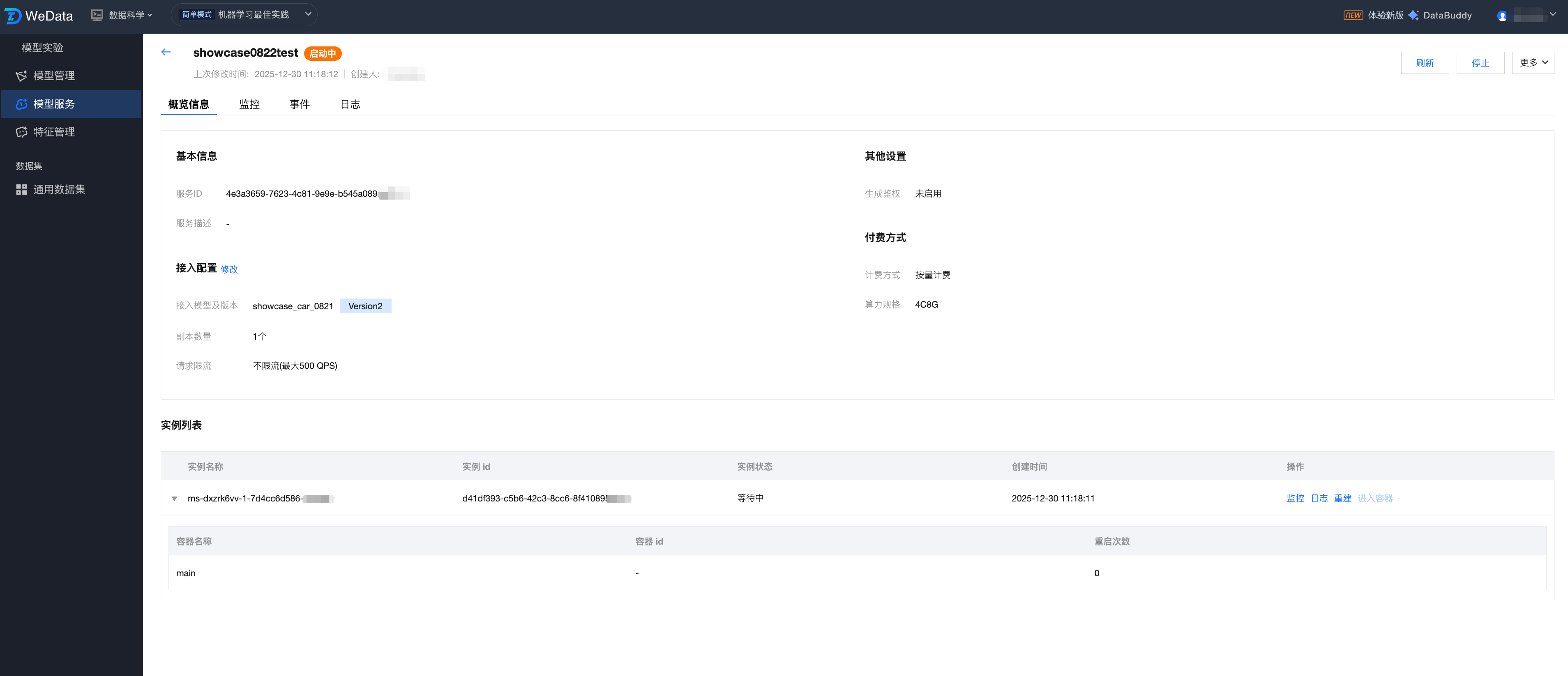 WeData 的模型服务提供新建服务、服务监控、服务调试等功能,可以更高效地管理服务,并确保它们在生产环境中的有效性。