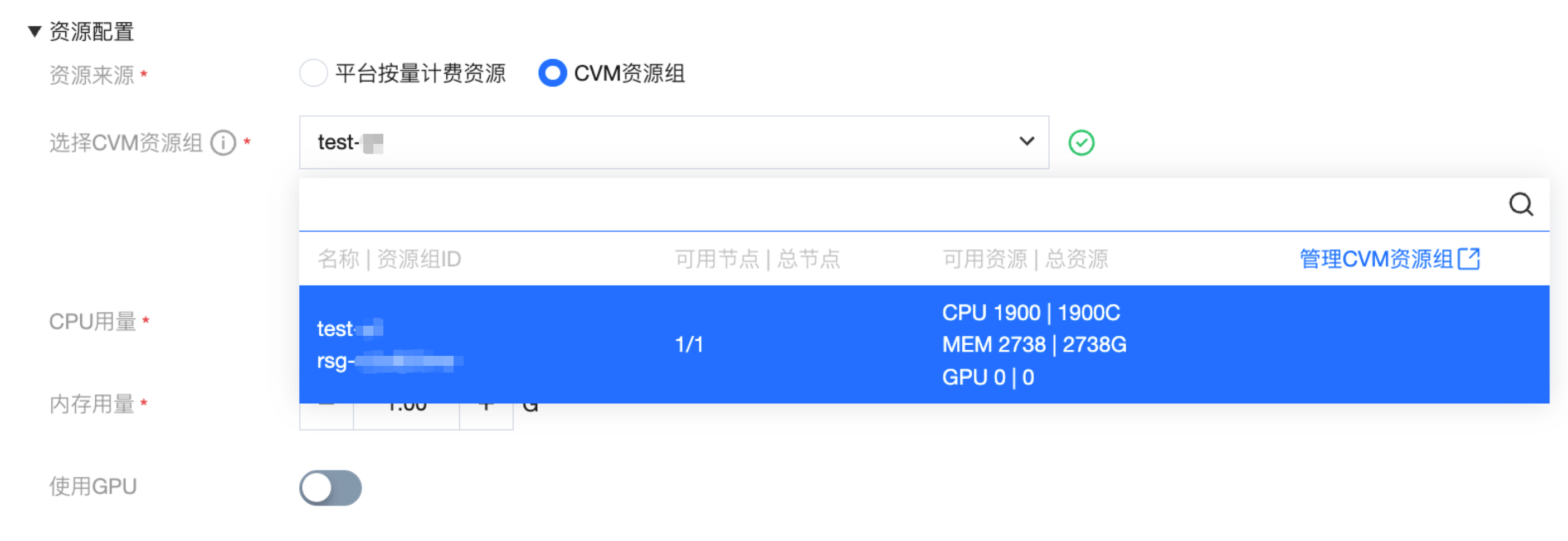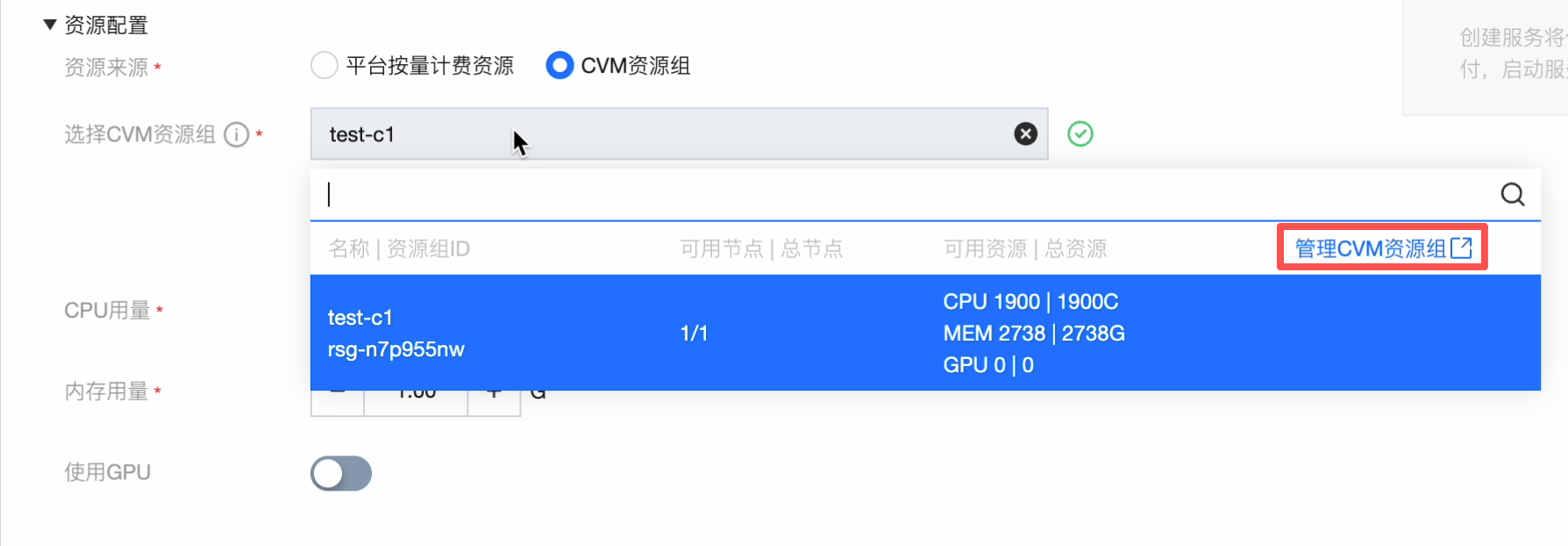 我们在部署模型服务时,需要配置资源来源,选择 CVM 资源组下拉列表会展示当前项目的可用资源组,可以自由配置 CPU 和内存的用量,是否使用 GPU 开关。