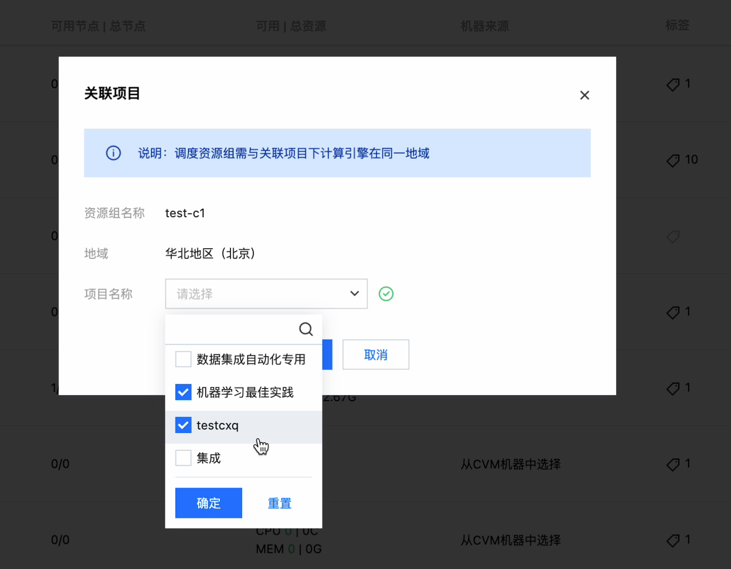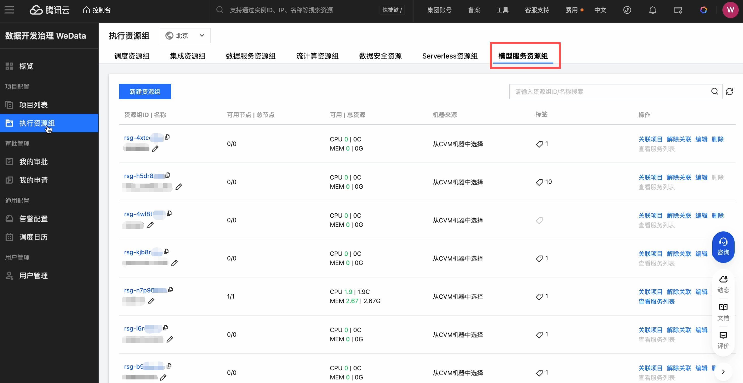 查看模型服务-资源组列表,点击操作按钮可以关联项目: