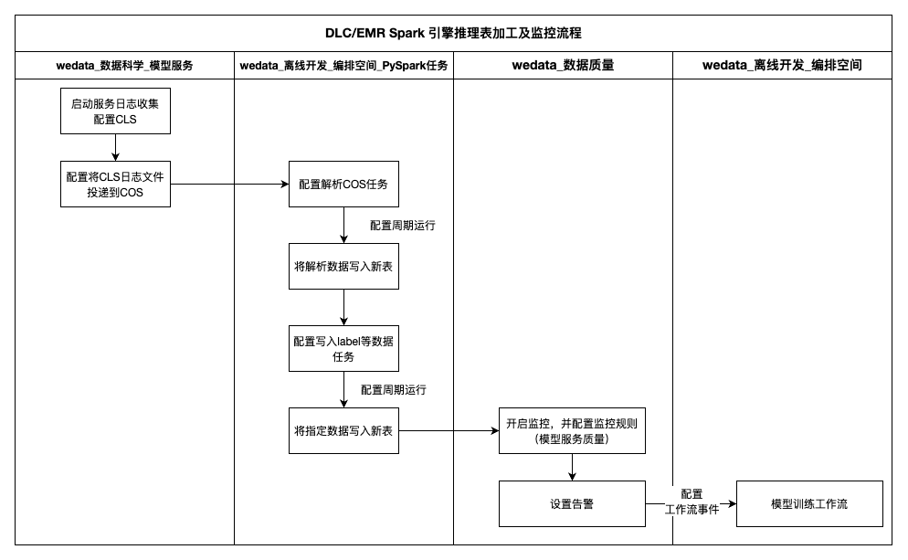 数据处理阶段:当日志数据成功投递到COS后,可以在WeData离线开发的编排空间中配置PySpark数据加工任务。通过编写相应的数据处理逻辑,对原始推理日志进行清洗、转换和结构化处理,提取出模型输入特征、预测结果、响应时间、错误信息等关键指标,最终将经过标准化处理的推理数据写入到专门的推理表中。