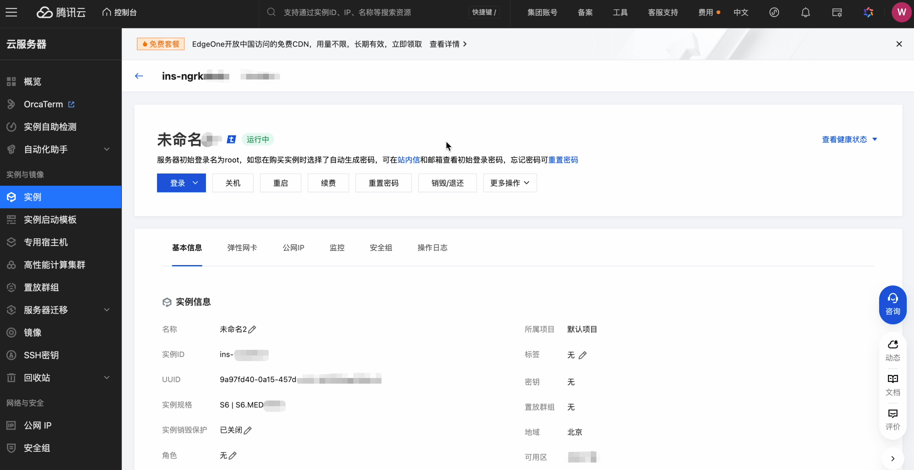点击实例ID跳转到实例详情页,支持对该实例进行登录,关机,重启,续费,重置密码,销毁/退还等操作,展示该实例相关信息
