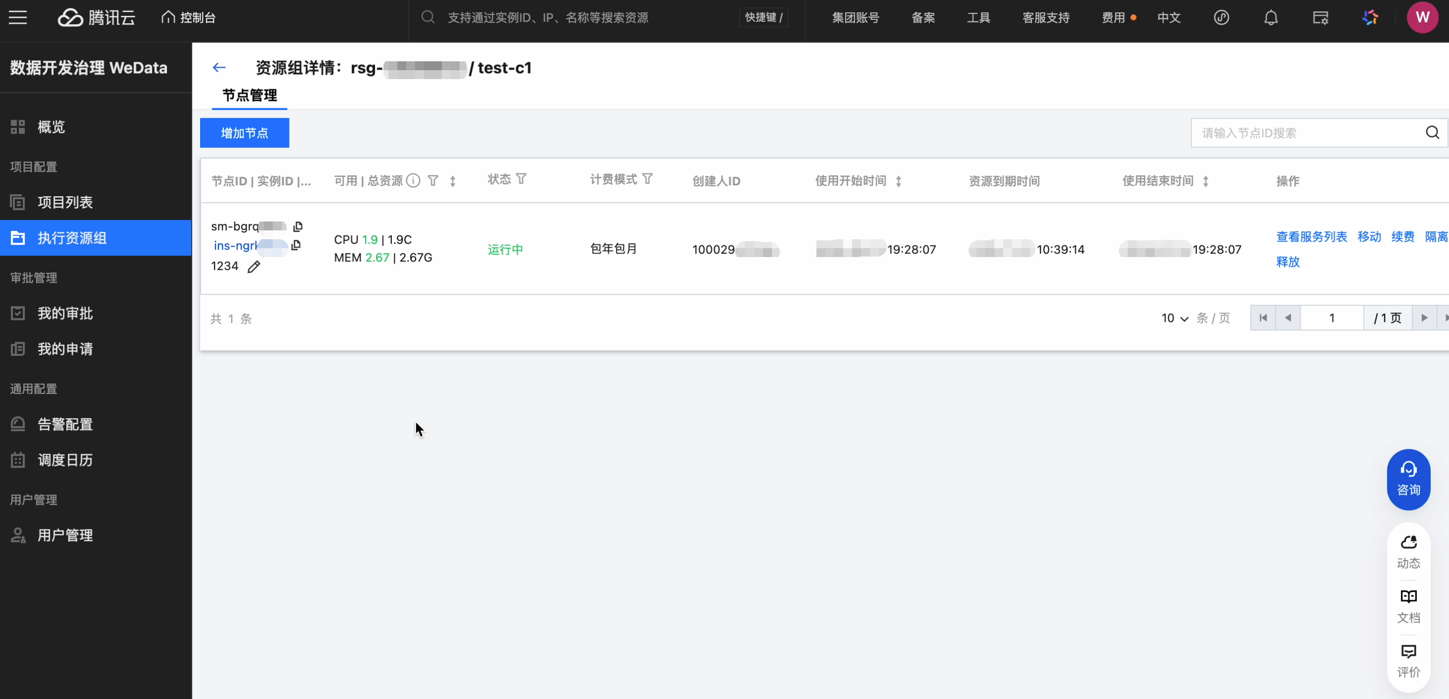 可以查看节点ID,可用资源,运行状态,计费模式,时间等信息,支持查看服务列表、移动、续费、隔离、释放等操作。