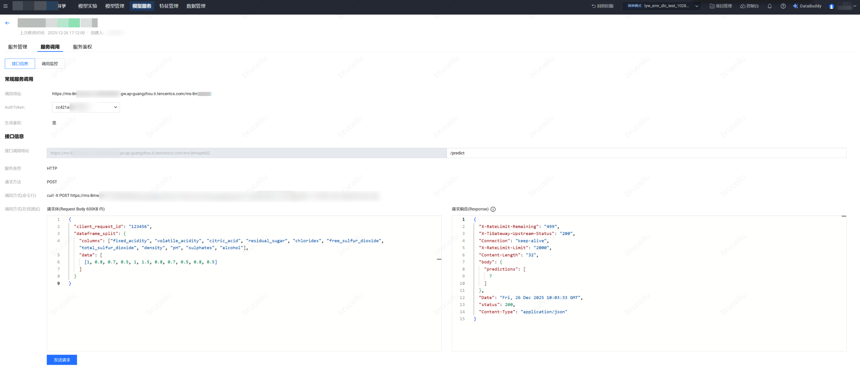 curl -X POST https://[服务调用地址]/predict \\-H 'Authorization: [鉴权Token]' \\-H 'Content-Type: application/json' \\-d '{"client_request_id":"123456","dataframe_split":{"columns":["fixed_acidity","volatile_acidity","citric_acid","residual_sugar","chlorides","free_sulfur_dioxide","total_sulfur_dioxide","density","pH","sulphates","alcohol"],"data":[[1,0.8,0.7,0.5,1,1.5,0.8,0.7,0.5,0.8,0.5]]}}'