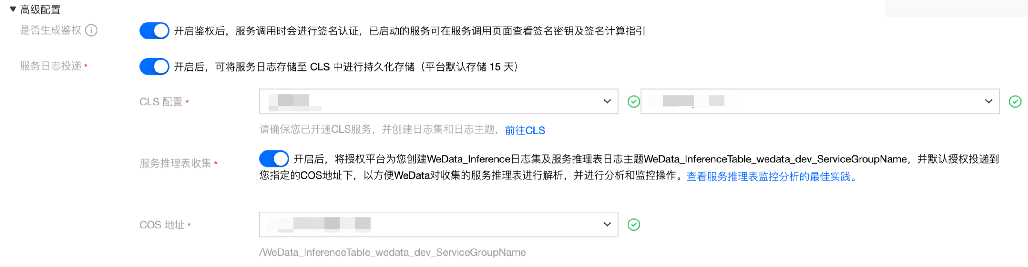 高级设置:是否开启鉴权,开启服务日志投递,配置COS存储地址。