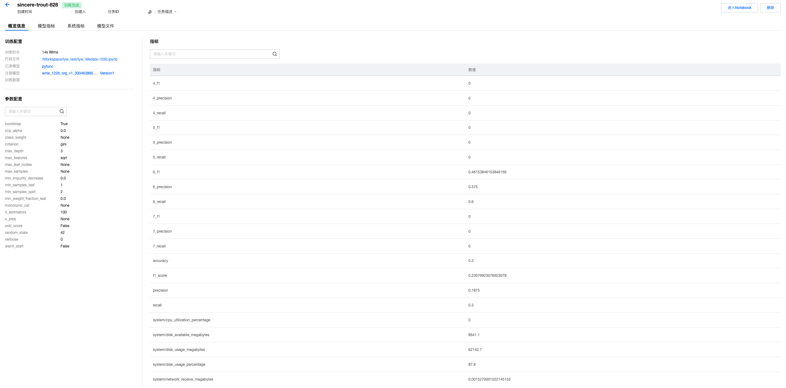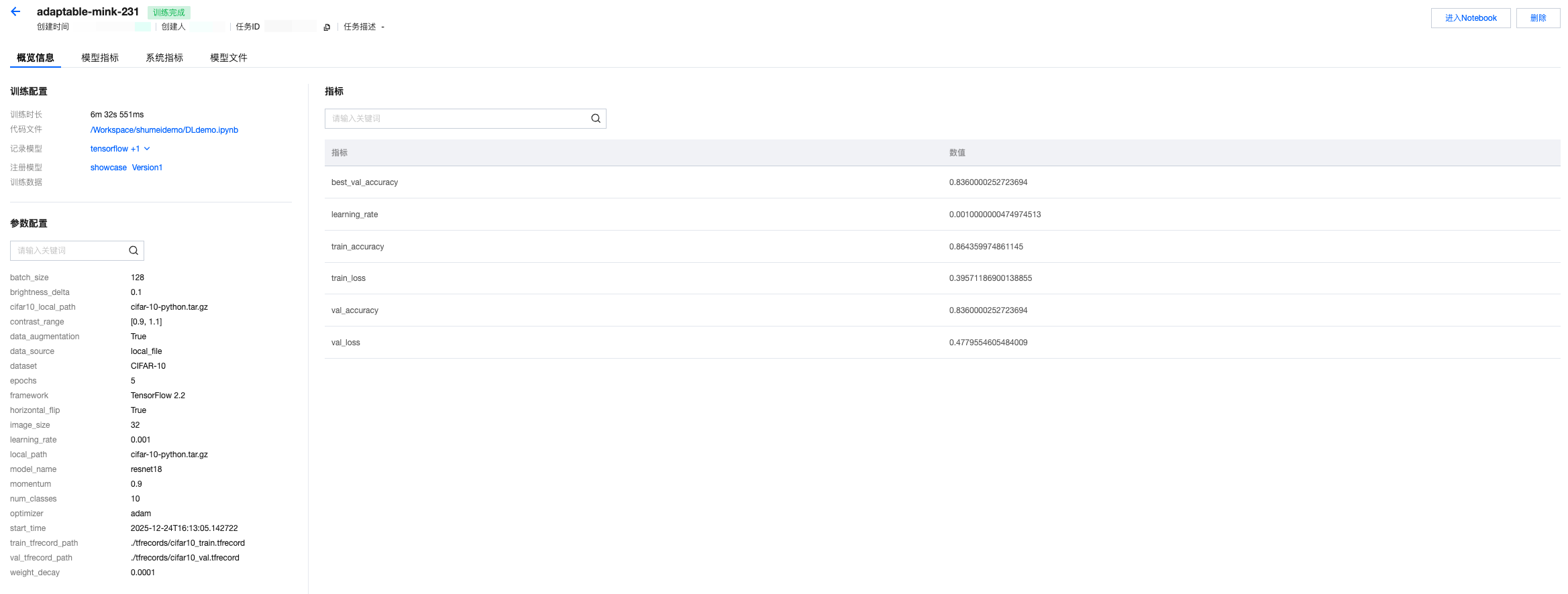 3. 单击任务名称,进入运行详情的概览页面,支持查看所上报的训练超参数、模型指标等。