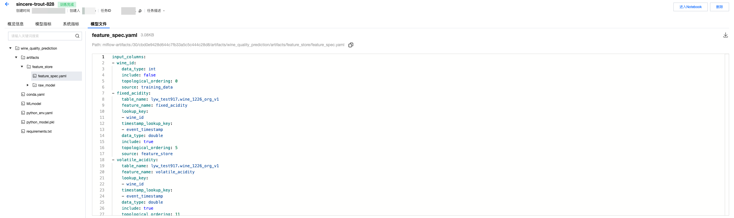 5. 查看模型文件。如果使用特征构建训练数据集,并且用特征工程API记录模型的话,会同时存储一个feature spec文件,帮助指引训练特征的来源。