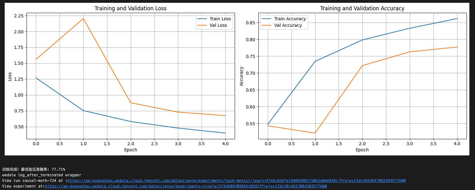 # 初始化训练器,并且从training_config.json中读取训练超参数# Initial trainer, and read training hyperparam from training_config.jsontrainer = CIFAR10Trainer('training_config.json')# 开始训练trainer.train()# 启动MLflow UI(在终端中运行)print("训练完成!请在实验管理中查看运行结果。Training complete!Please check task result")