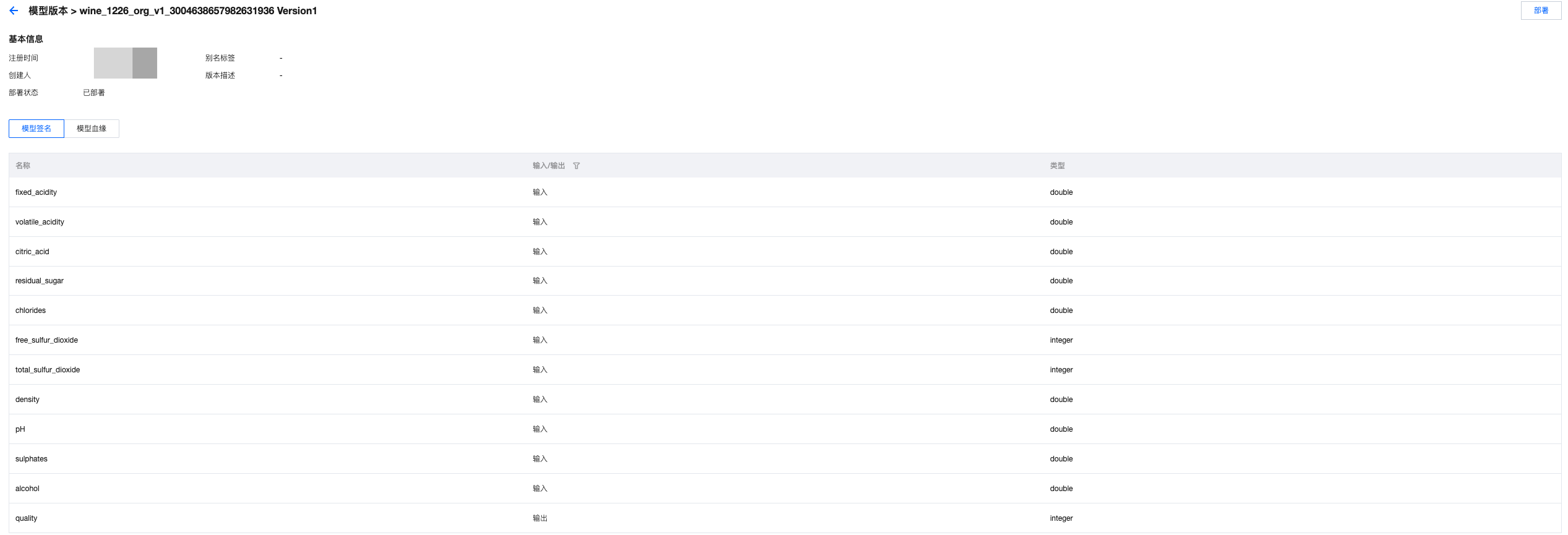 3. 单击模型版本,可以查看模型签名、模型血缘等信息。