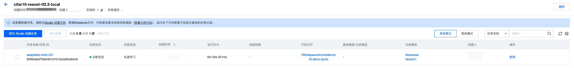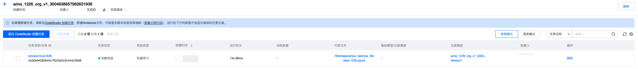 2. 单击实验名称,进入运行记录页面,可以查看刚刚上报的任务记录,在界面显示任务名称、任务状态、创建时间、持续时间、代码文件、注册模型等信息。