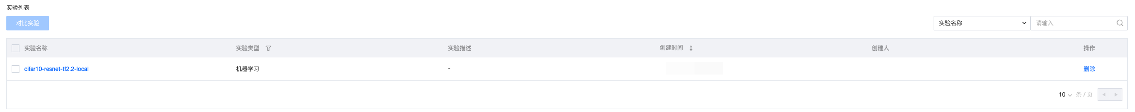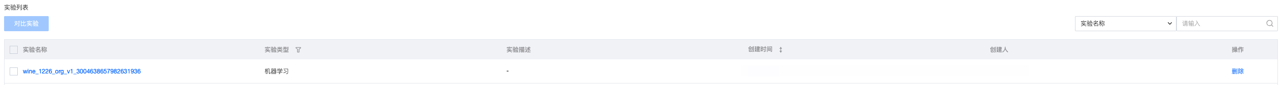 1. 单击进入数据科学的实验管理模块,发现刚刚代码中运行的记录已经在实验管理中可以被查看到,在界面显示实验名称、实验类型、实验描述、创建时间、负责人、操作项等信息。