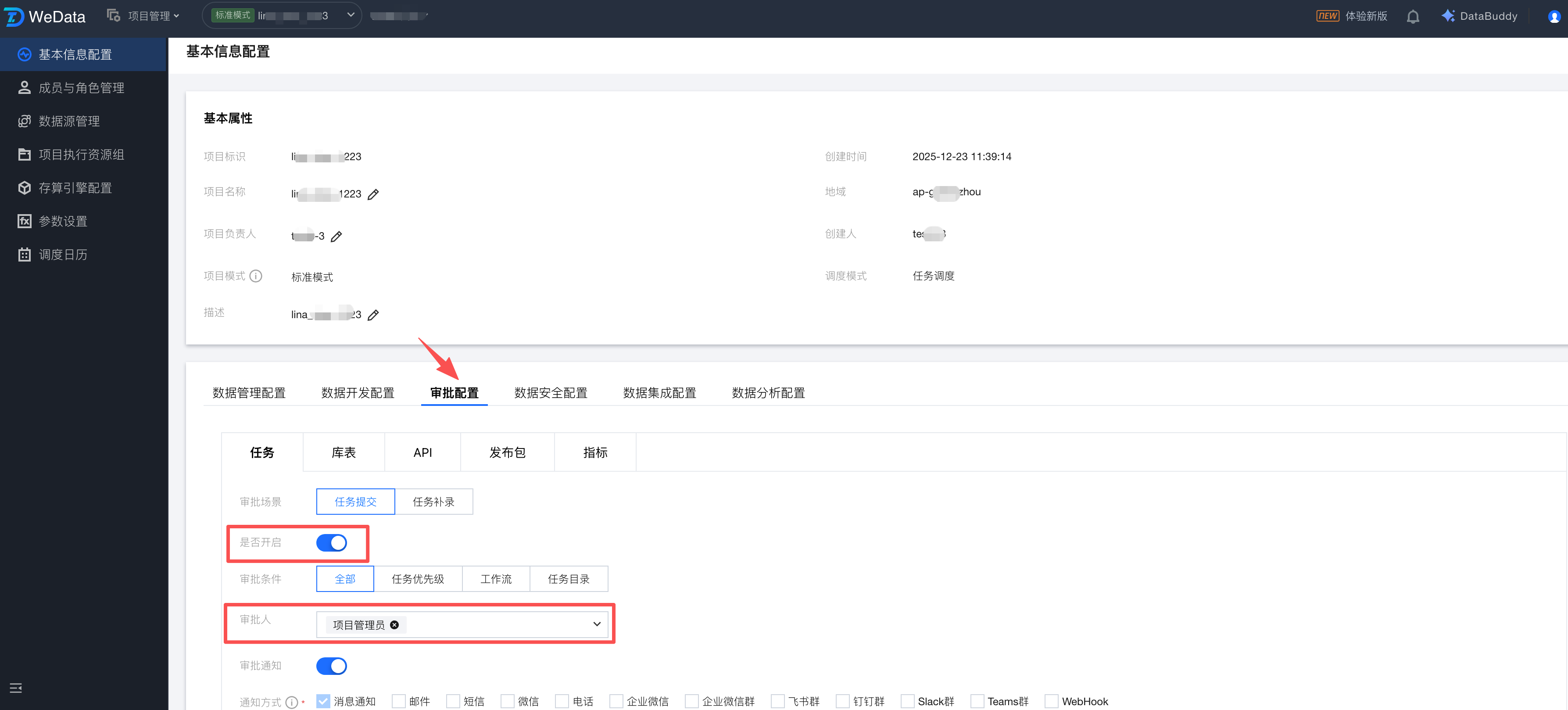 若您希望质量节点上线前由专人审批,可以登录 WeData 控制台,在项目管理 > 基本信息配置 > 审批配置中开启任务审批,并选择审批人。