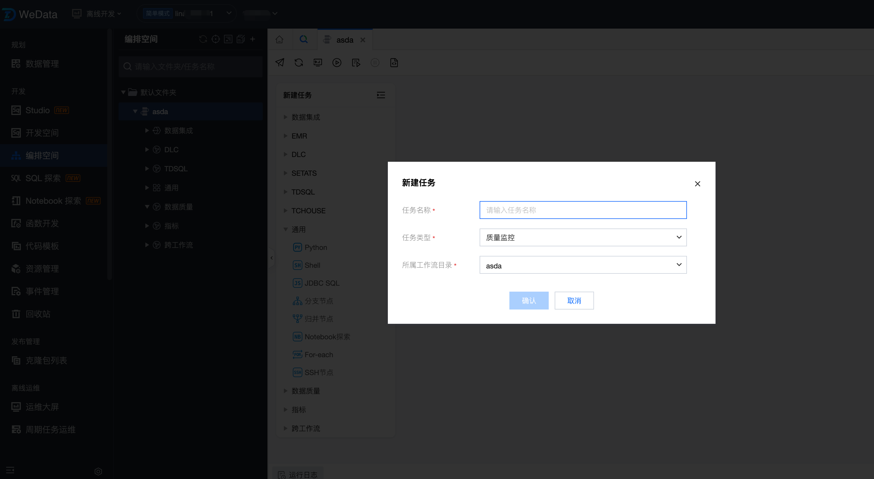 3. 在新建节点对话框输入节点名称,单击确认,节点创建完成,您可在节点中进行对应任务的开发与配置。