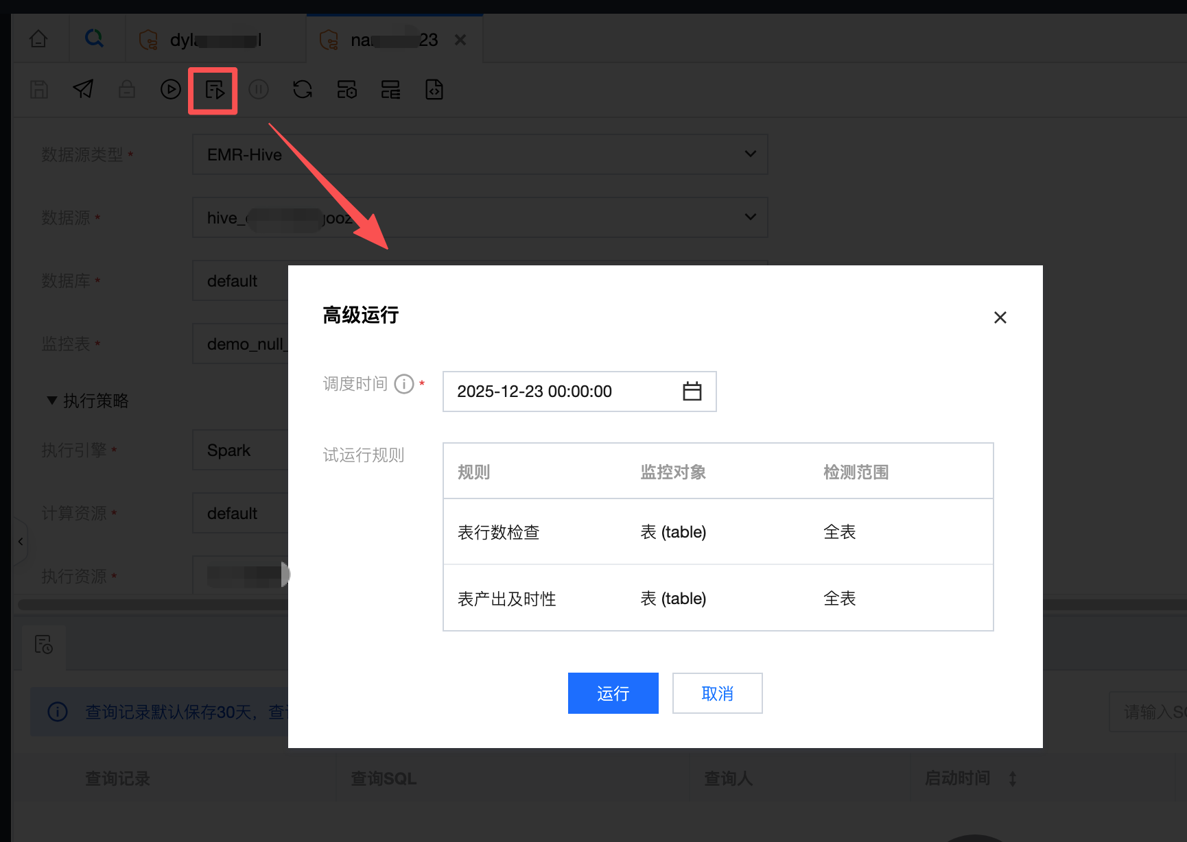 数据质量:数据质量监控节点发布后,您也可进入数据质量模块查看该表的监控详情,但不允许执行修改、删除等管理操作。详情请参见数据质量监控列表。
