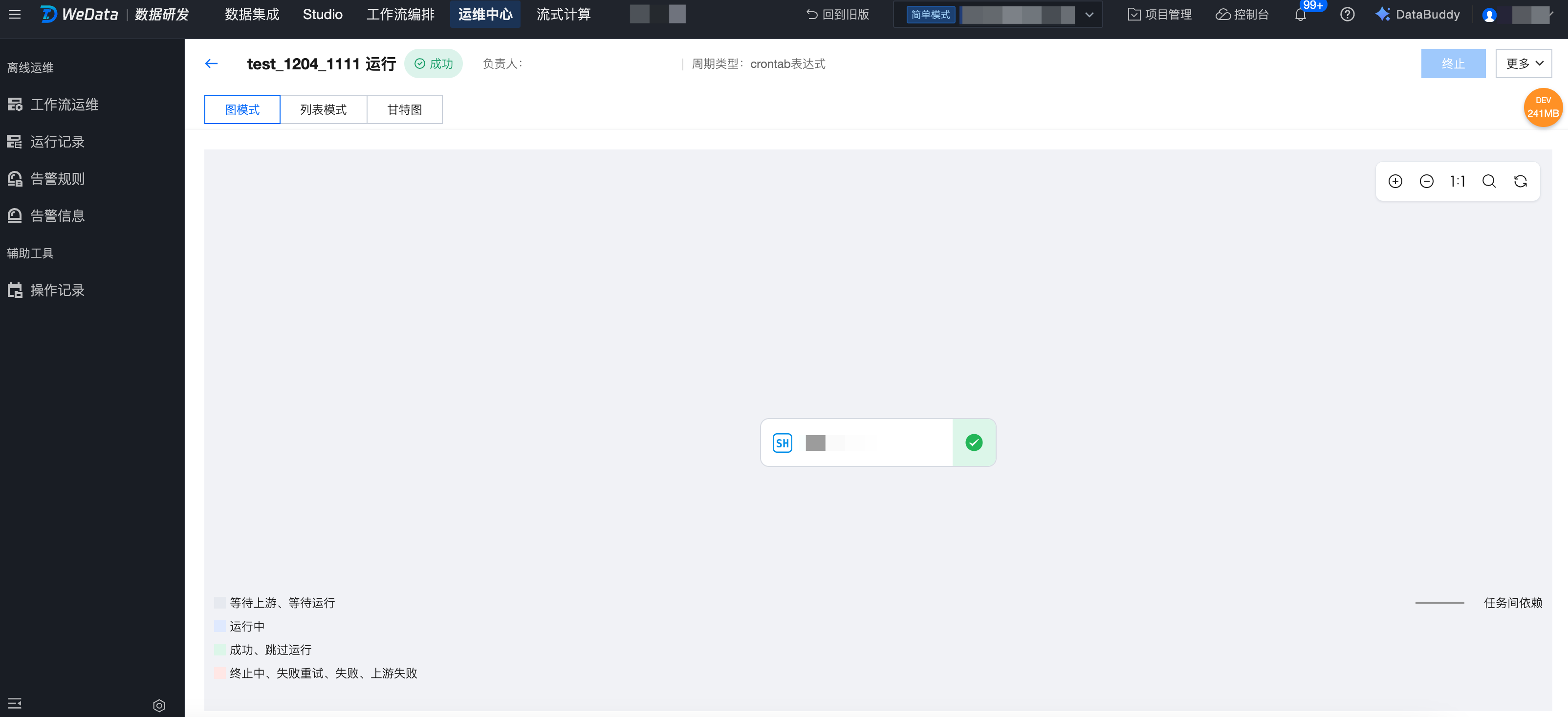 工作流运行详情页:在工作流运行详情页可以查看工作流运行下任务节点的运行情况,支持按照图模式、列表模式、甘特图模式查看。