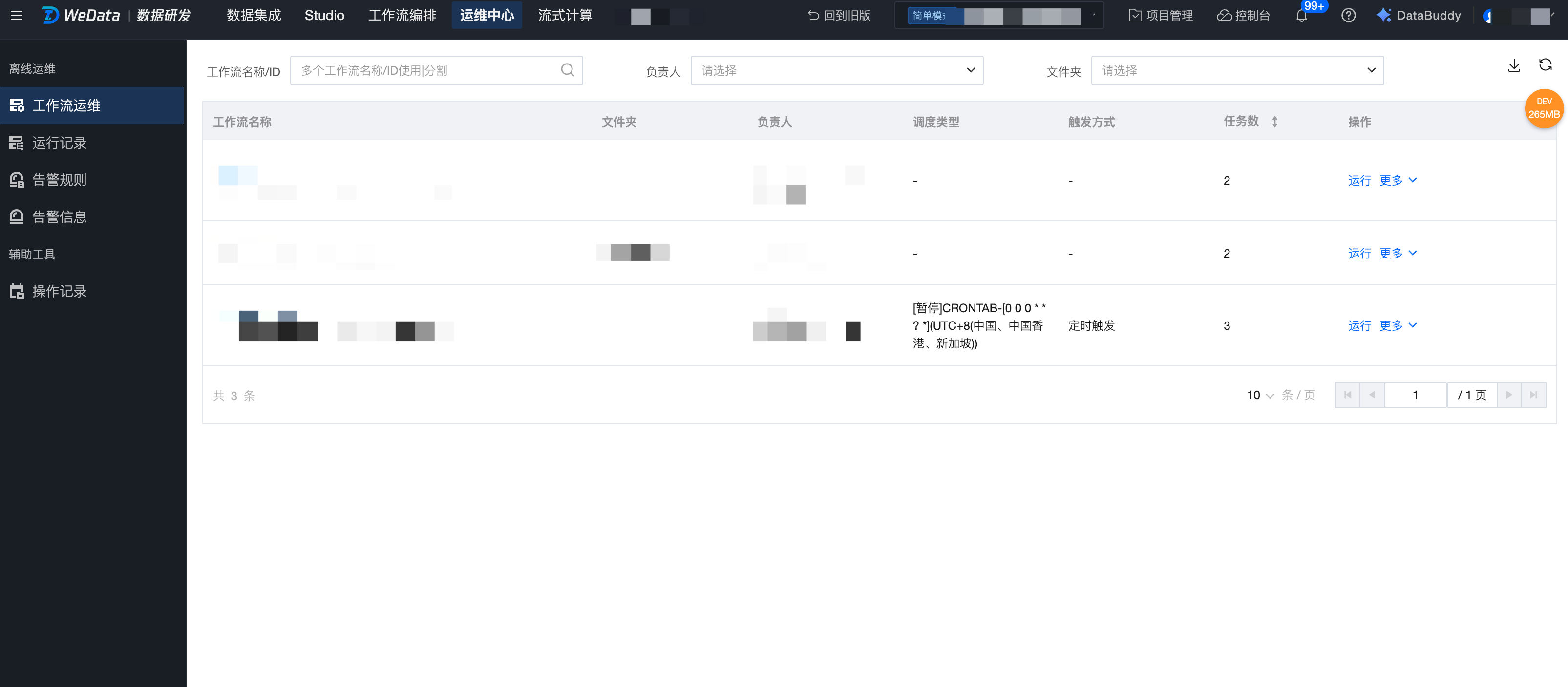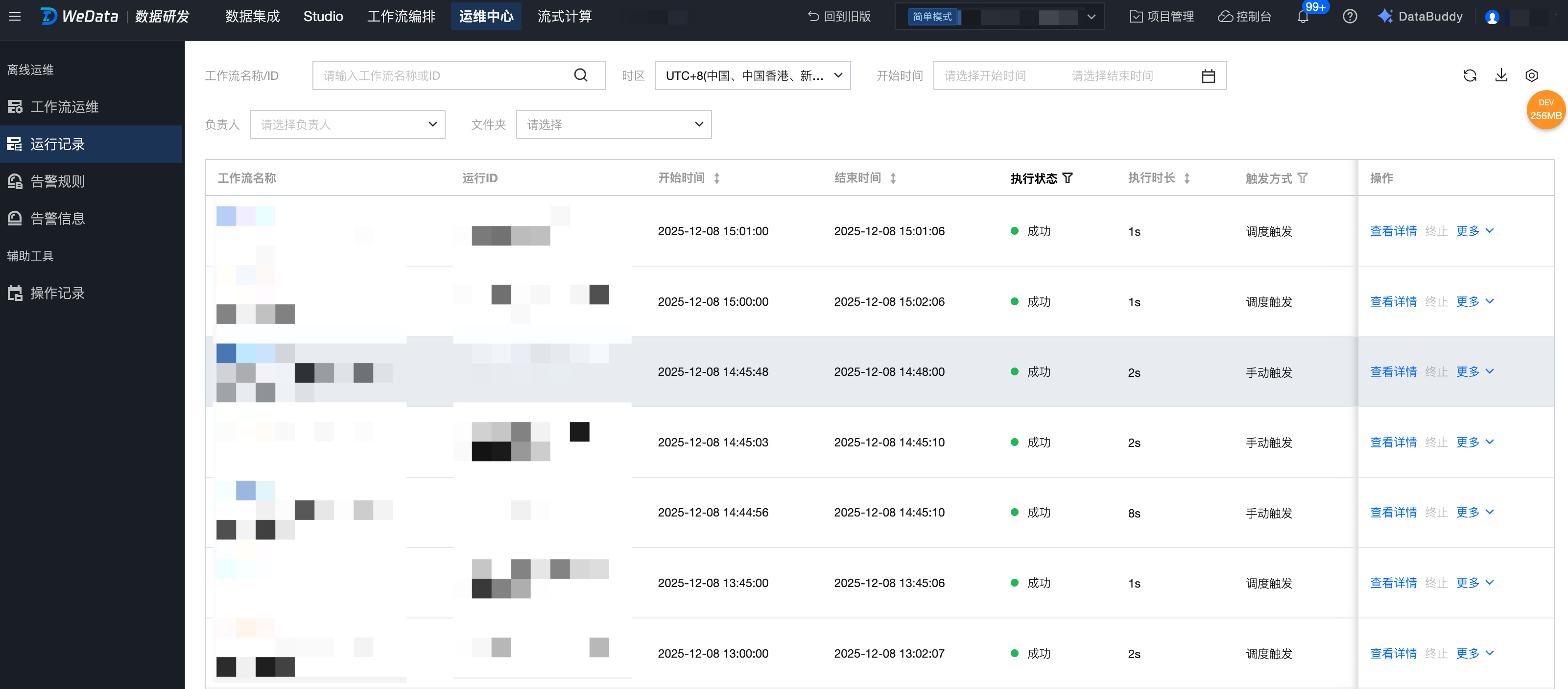 工作流运行列表:工作流周期运行或手动操作运行的记录,会在工作流运行列表展示。可以查看运行的基础信息,进行基础操作。
