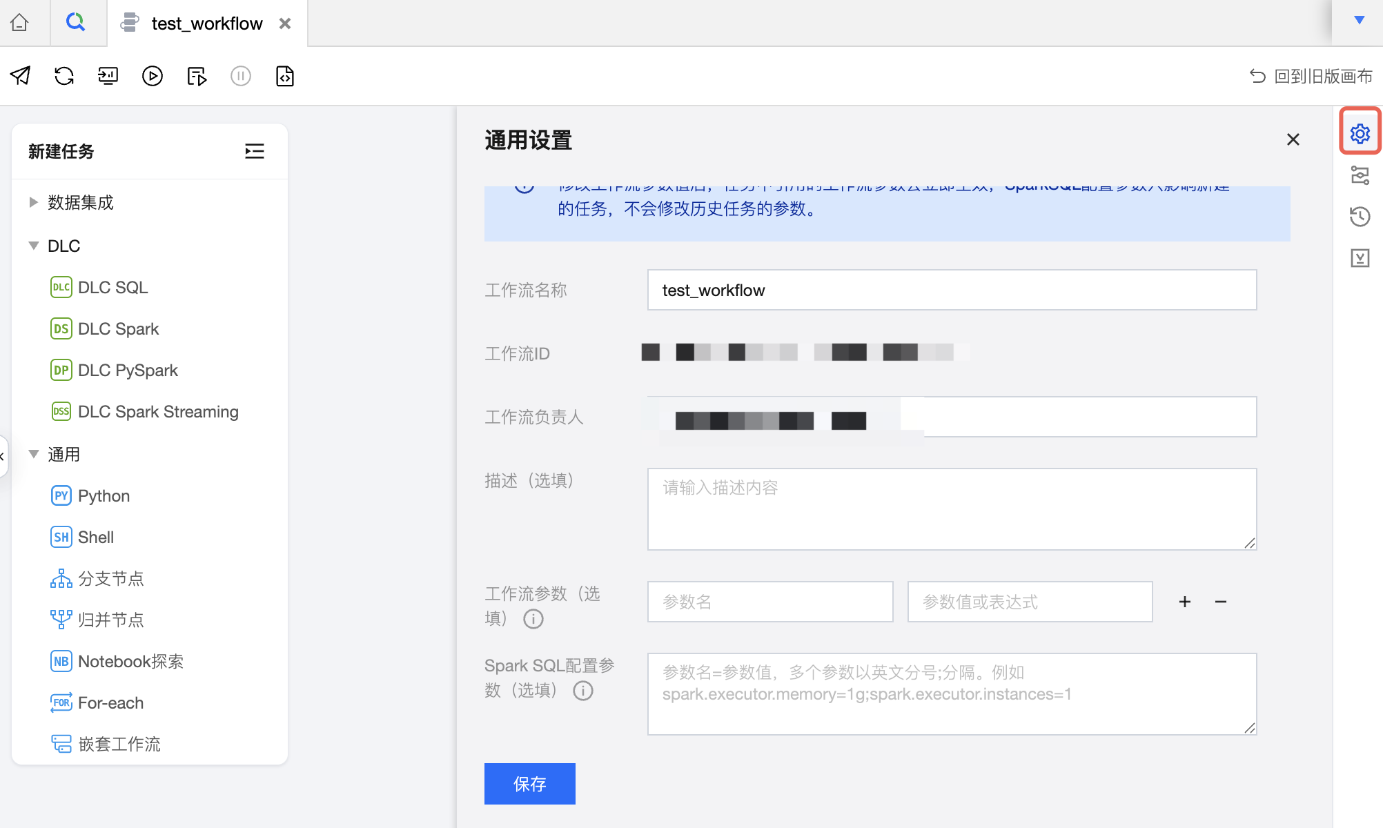 打开右侧抽屉通用配置,完成工作流名称、工作流负责人、描述、工作流参数、Spark参数等基础信息的配置。