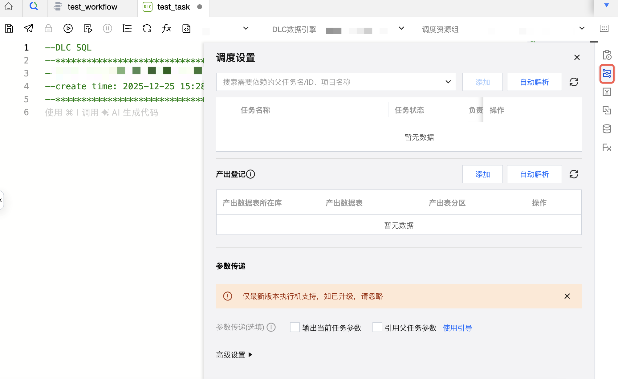 任务调度设置包含上游任务配置(仅支持选择当前工作流下的其他任务,即不支持跨工作流依赖)、产出登记、参数传递、高级设置功能。