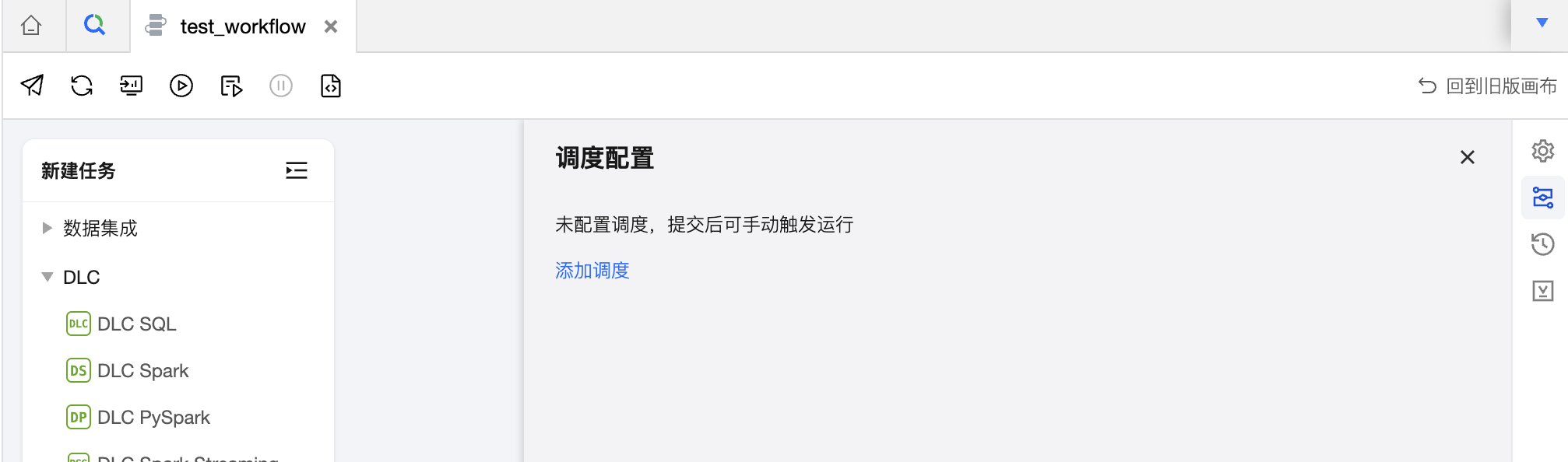 打开右侧抽屉调度配置。若未配置情况下则默认提交后不周期运行。您可在运维中心手动触发运行(类型任务调度模式下手动工作流的能力)。
