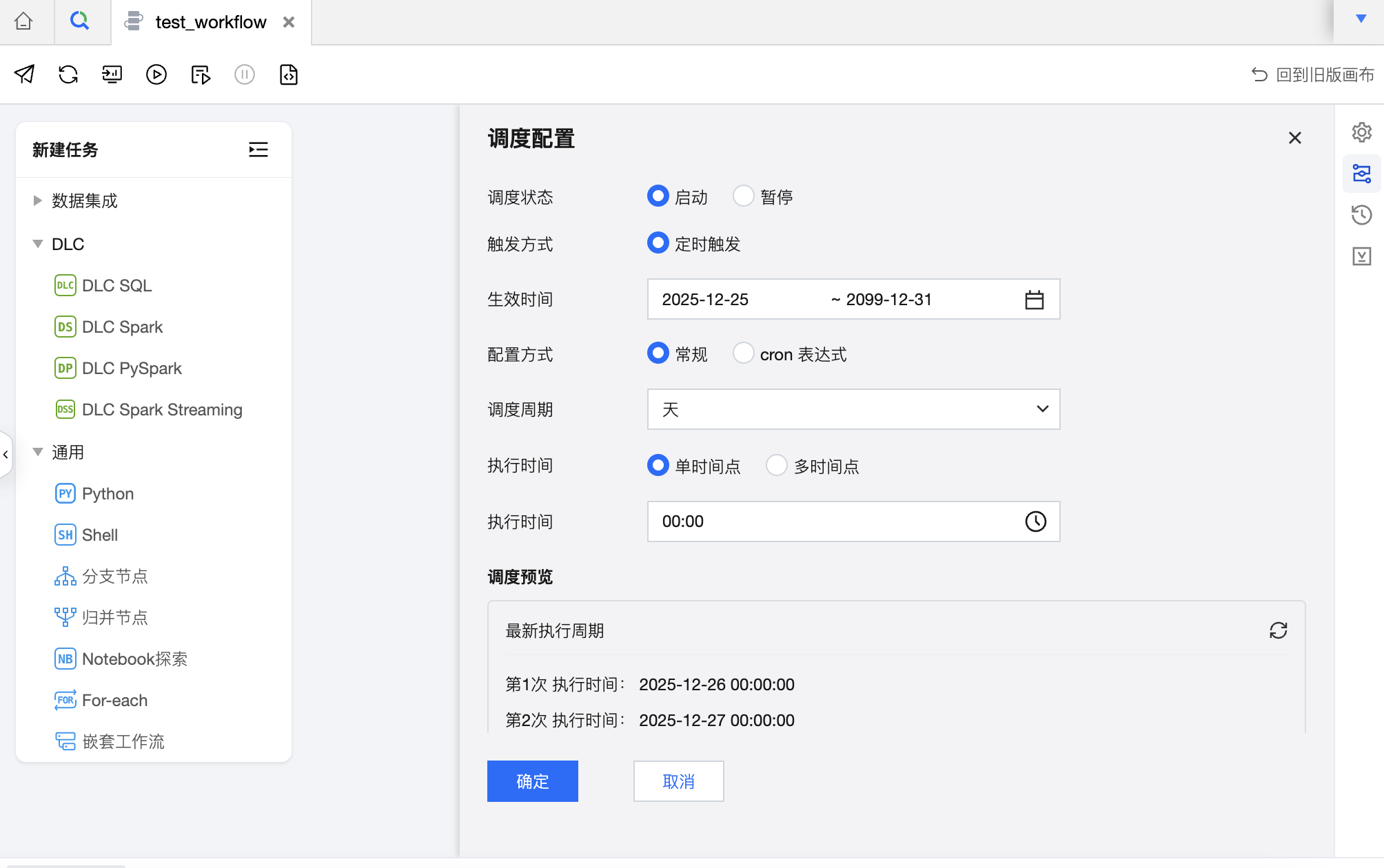 常规模式下支持天、周、月、年、小时、分钟周期类型的调度配置。