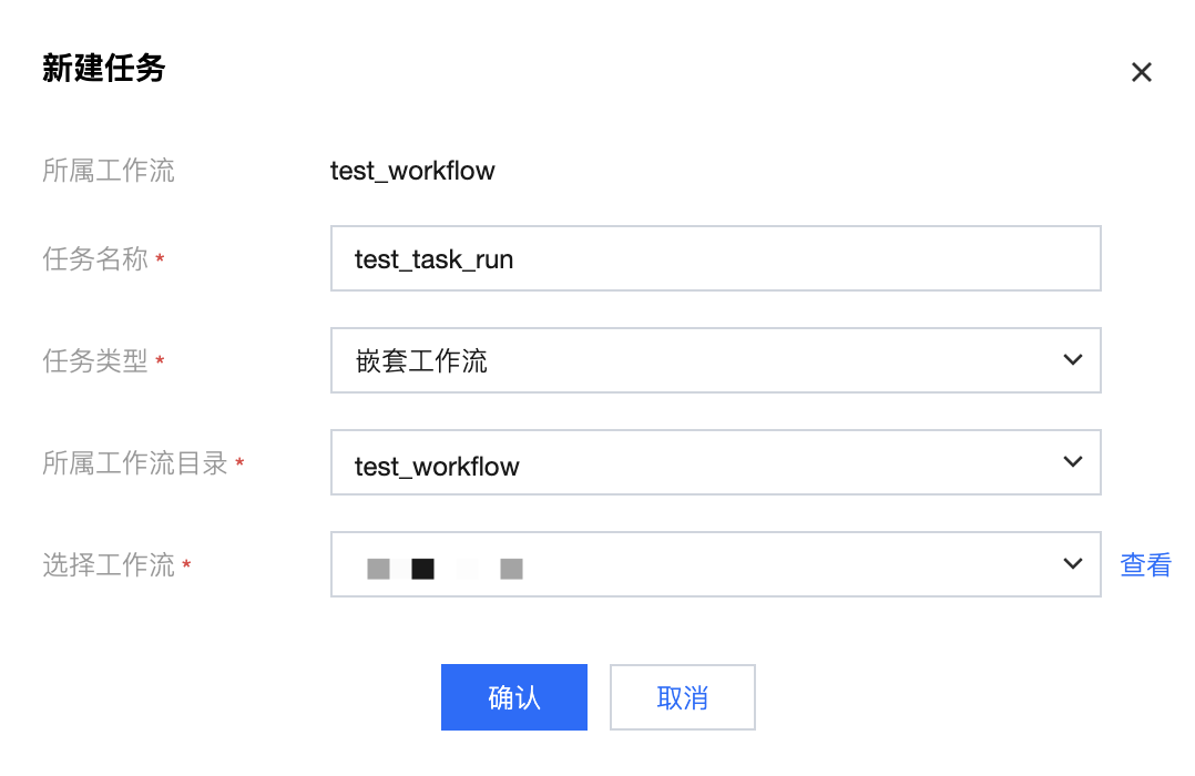 新建嵌套工作流任务:任务类型选择嵌套工作流,选择一个被嵌套的工作流,被嵌套工作流仅支持选择同项目下其他工作流。