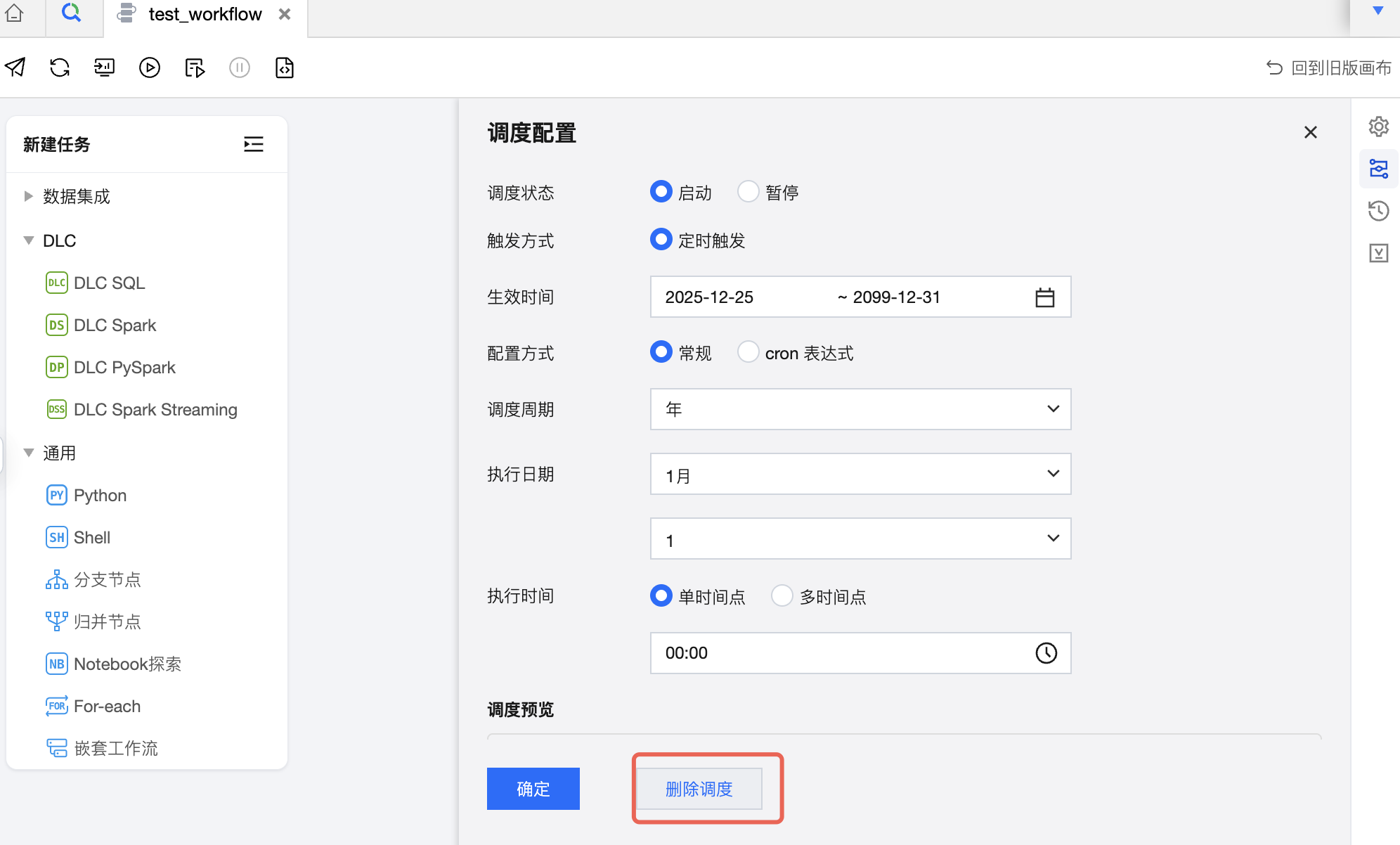 已配置的调度也可进行删除,即不周期调度,可手动触发调度。