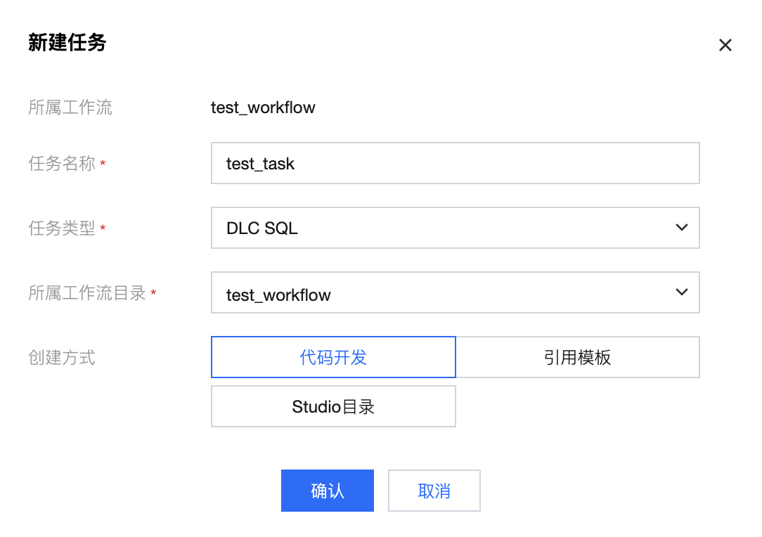 配置任务名称、任务类型、所属工作流目录等基本信息,完成任务创建。