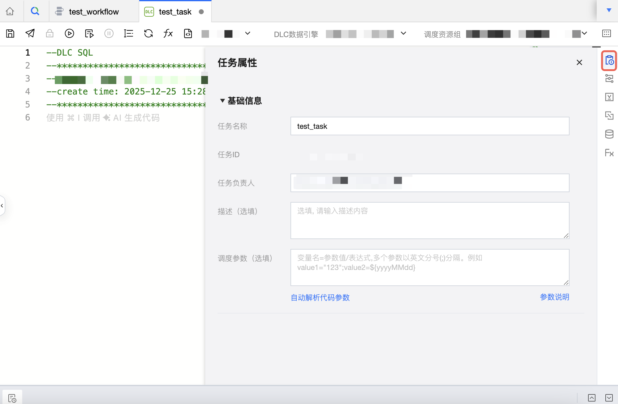 完成任务名称、任务负责人、描述、调度参数等基础信息配置。