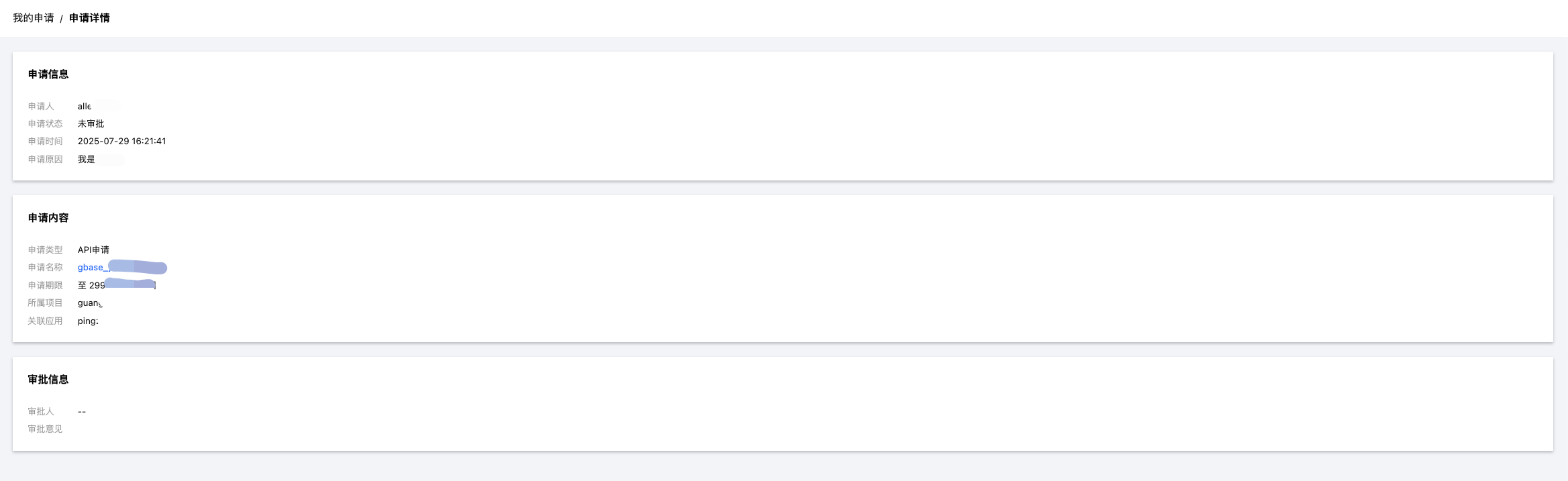 选择对应的权限申请单,单击查看,即可进入申请详情页面,该页面会展示申请单的申请信息和申请内容。