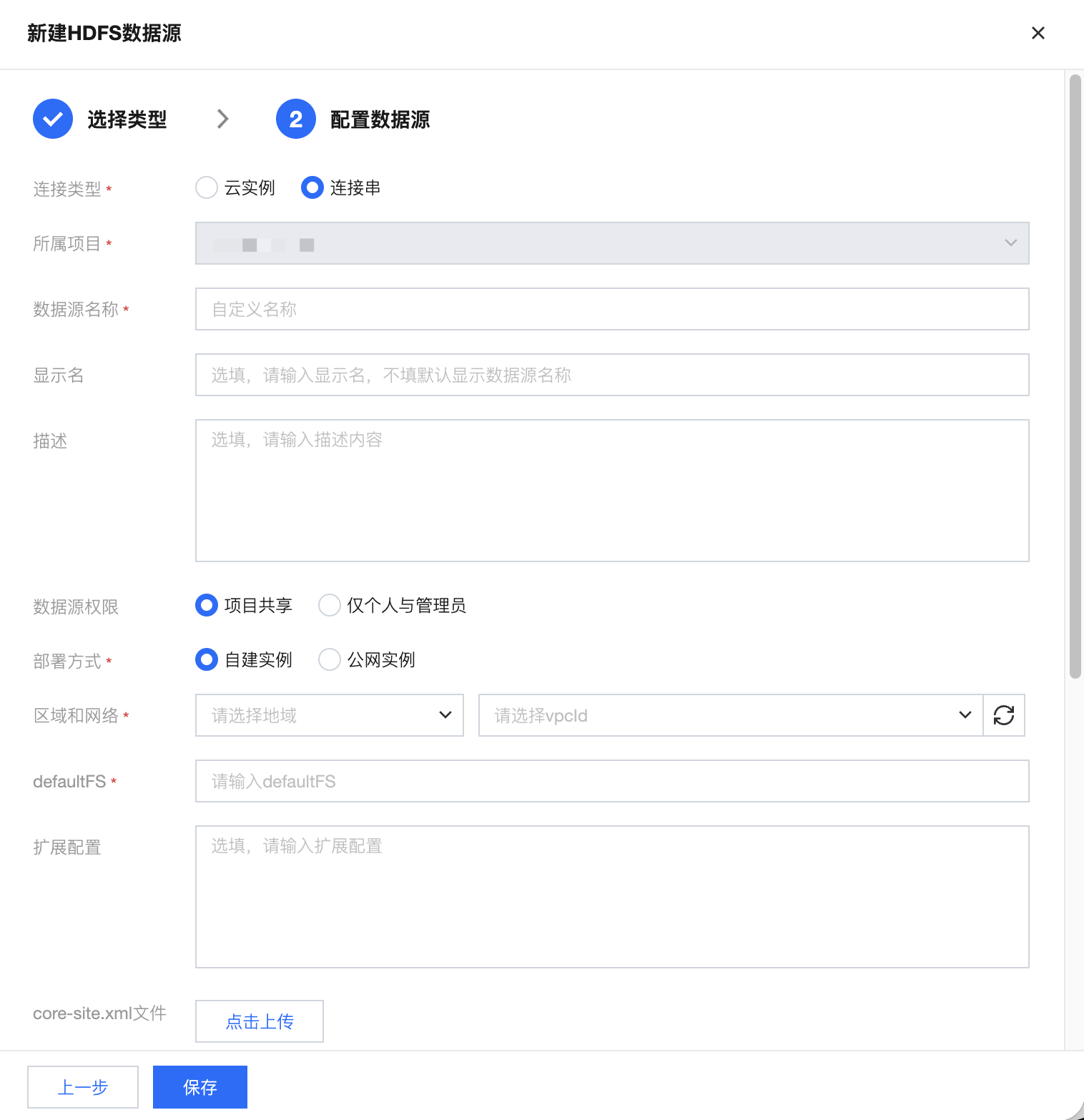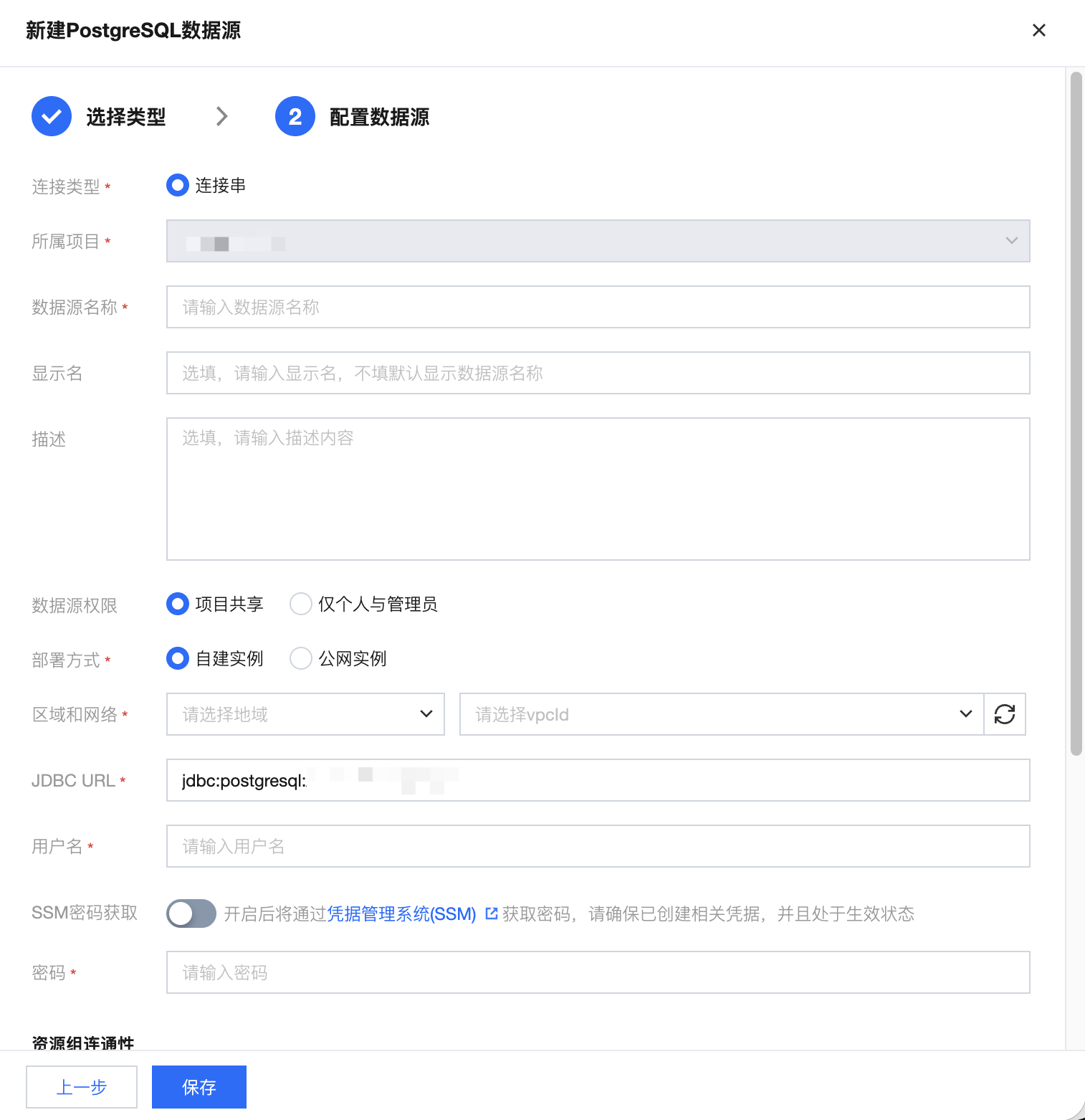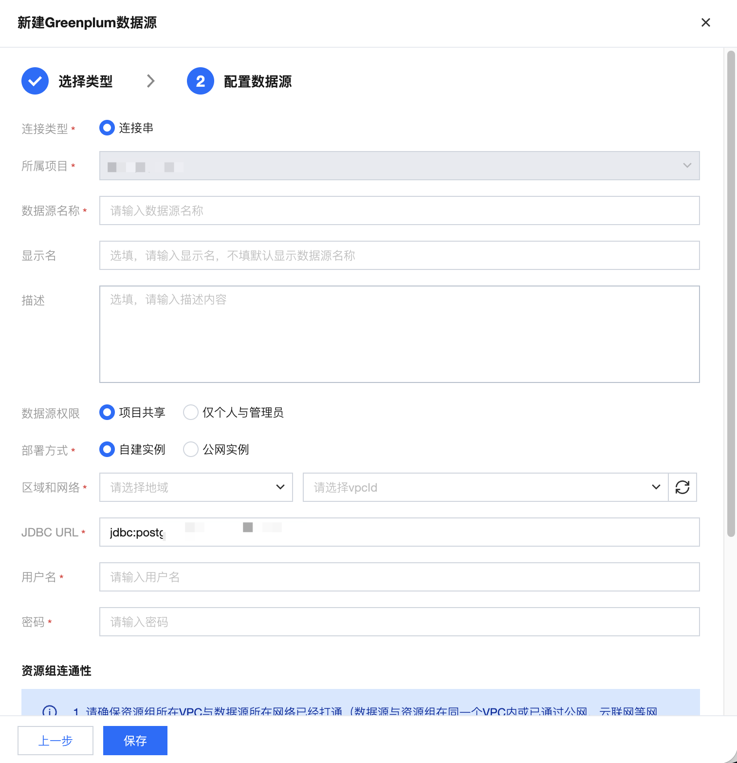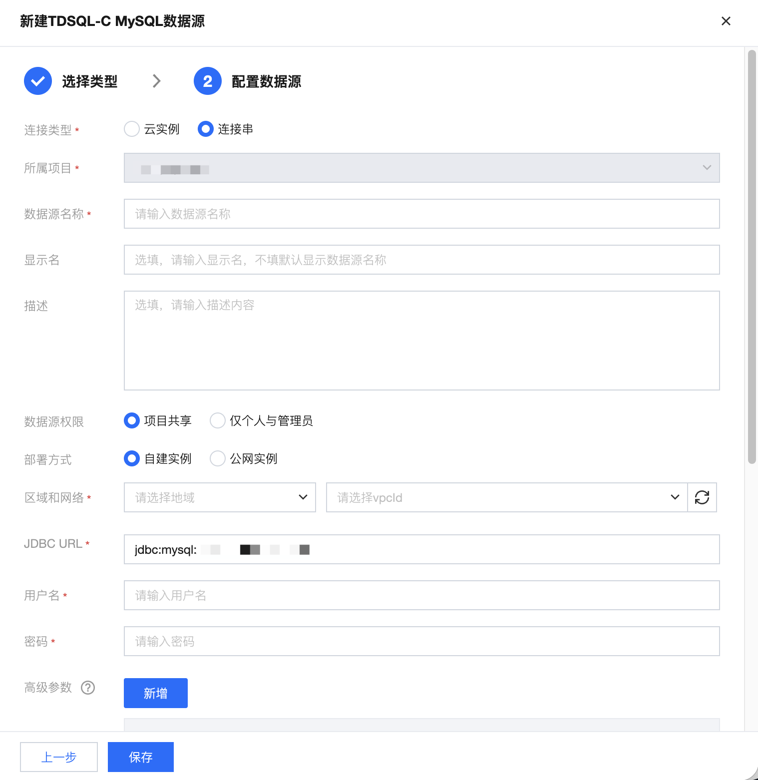 区域和网络 | 当选择自建实例时,需要选择数据源所在地域与 vpcID |