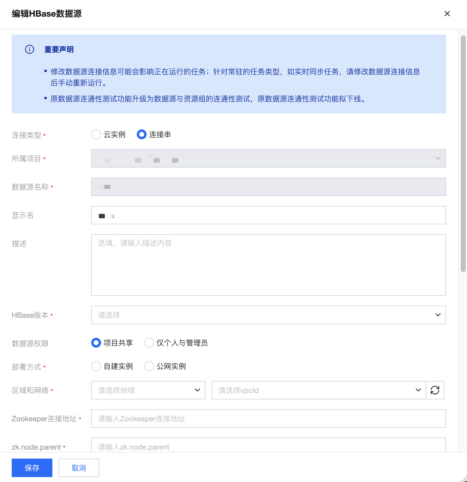 连接串:通过连接串方式可配置描述、HBase 版本、描述、部署方式、Zookeeper 连接地址等。