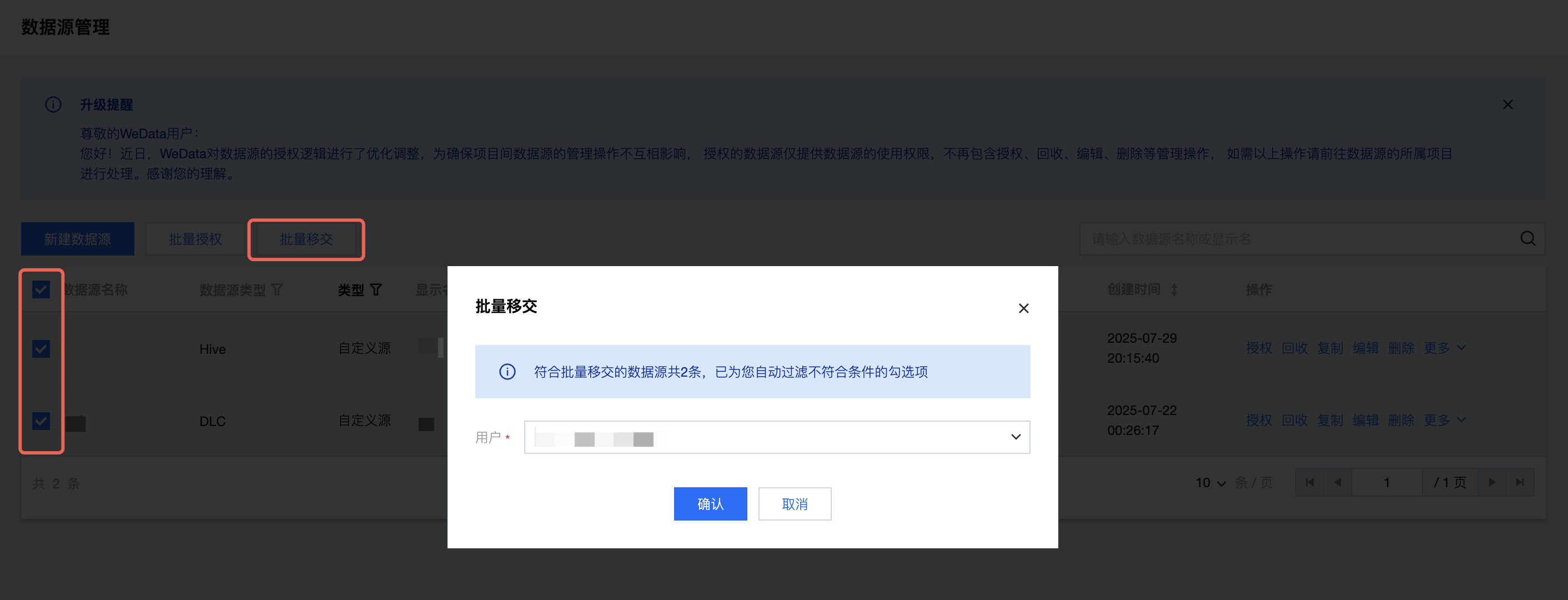 选中数据源,并单击左上角批量转交。