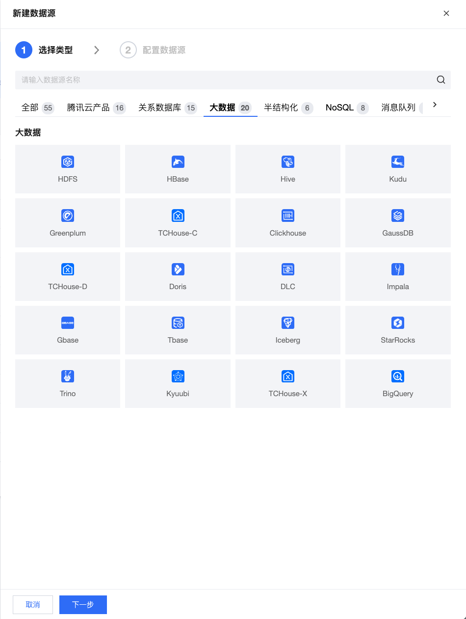 大数据:HDFS、HBase、Hive、Kudu、Greenplum、TCHouse-C、Clickhouse、GaussDB、TCHouse-D、Doris、DLC、Impala、Gbase、Tbase、Iceberg、StarRocks、Trino、Kyuubi、TCHouse-X、BigQuery;