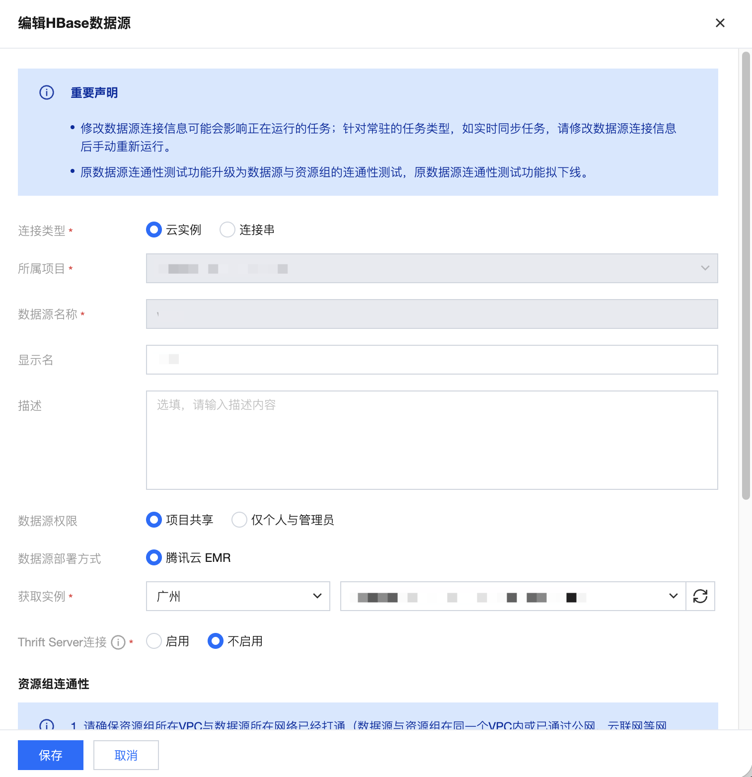 除数据源名称和所属项目外,其他配置项均可编辑。