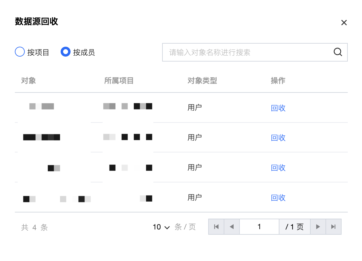 选择需要回收权限的目标项目或成员,单击回收。