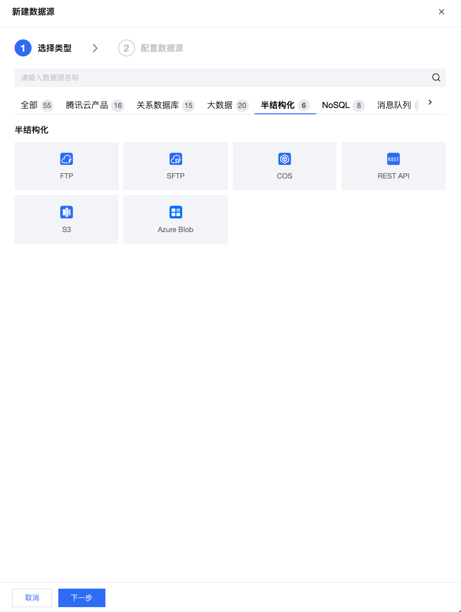 腾讯云 WeData 当前版本支持 FTP、SFTP、COS、REST API 等六种半结构化数据源,其中 COS 是腾讯云产品。