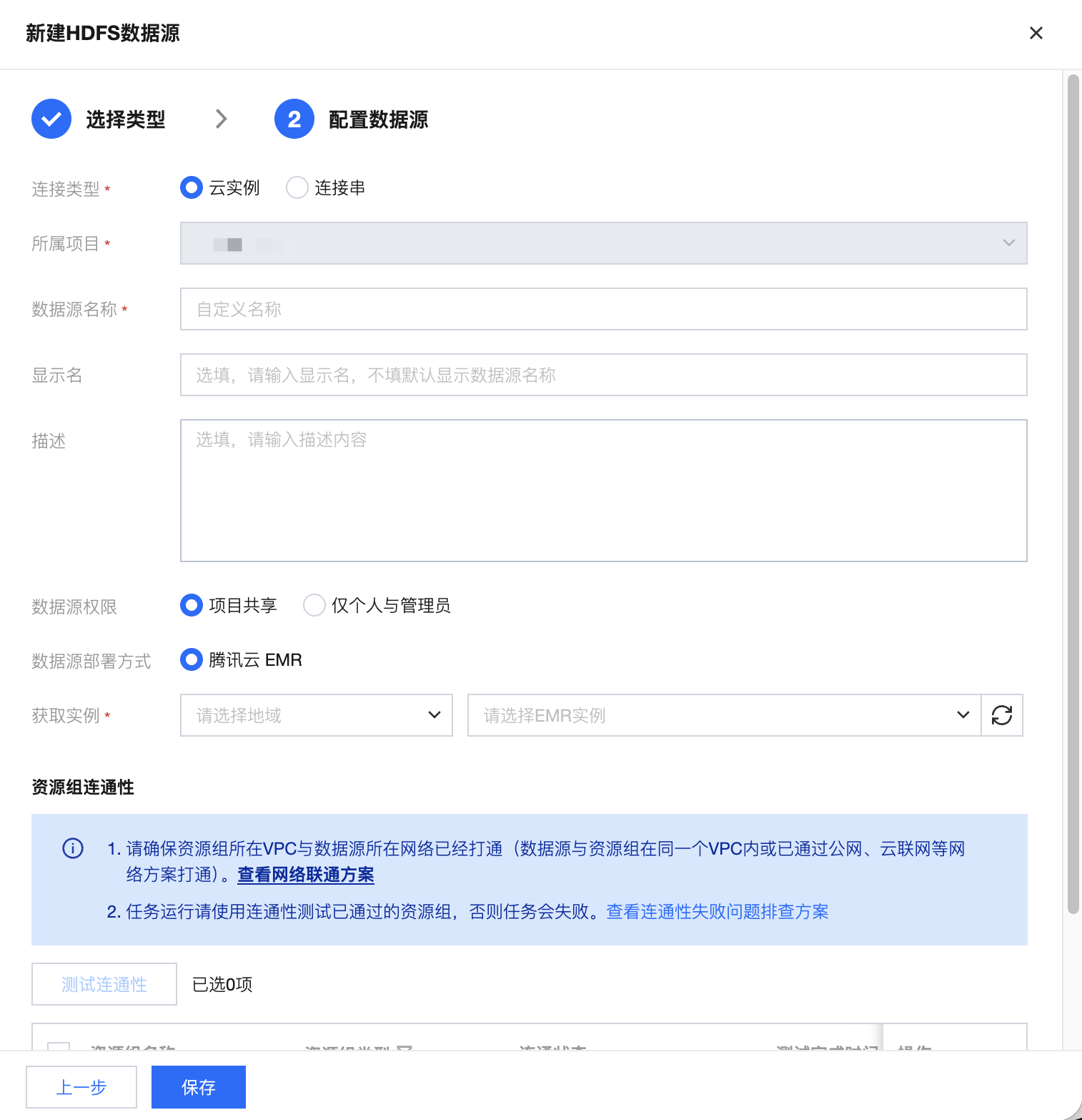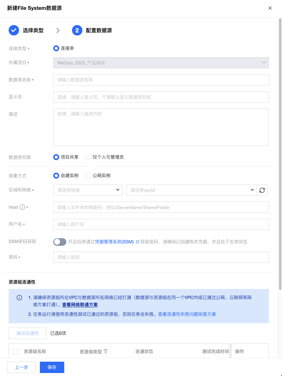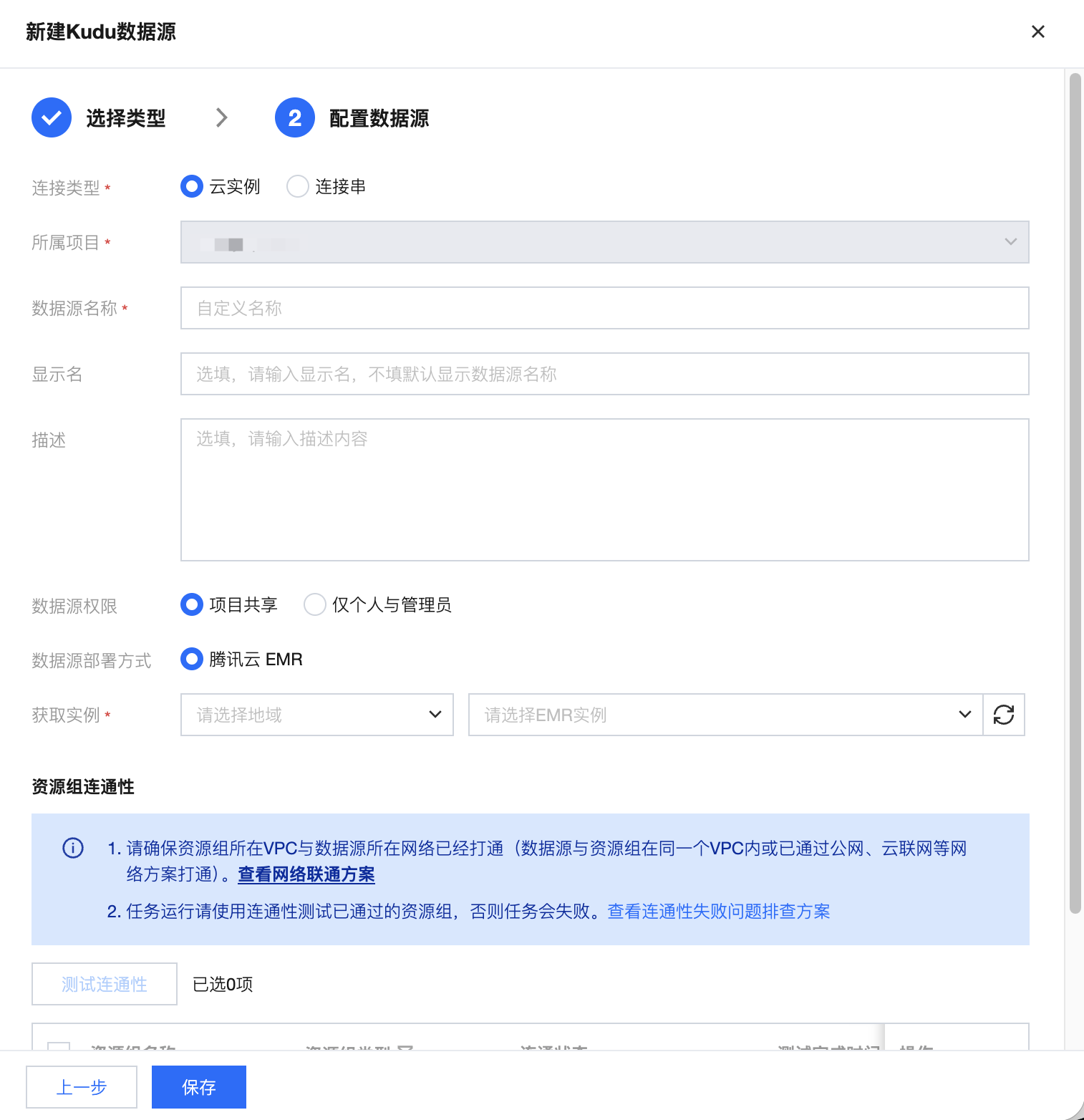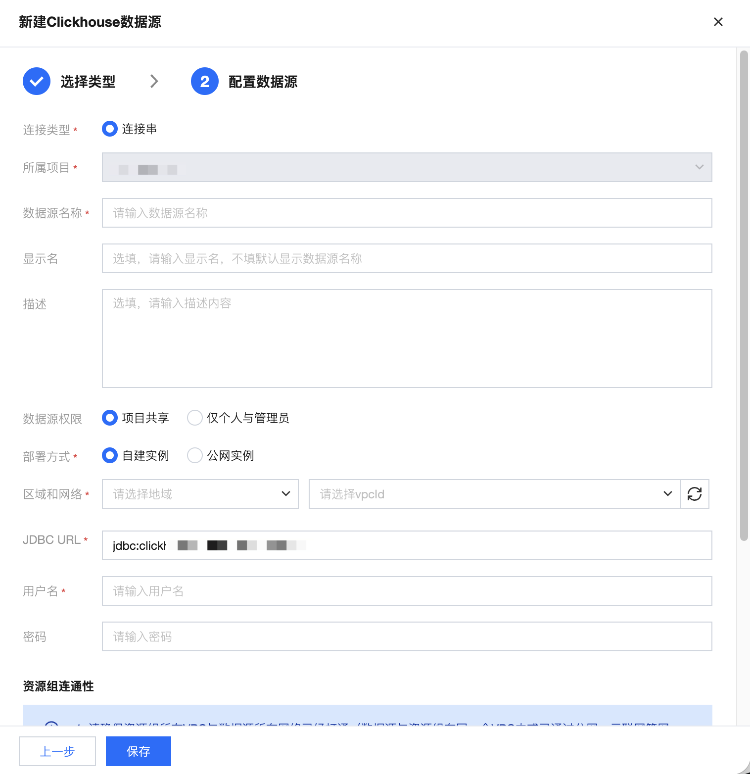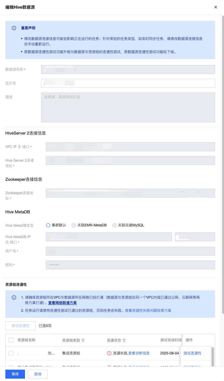 资源组连通性 | 测试是否能够连通所配置的数据库(若连通性测试不通过,会给出错误提示供排查原因,同时,数据源仍可保存,但该数据源使用时会发生异常) |