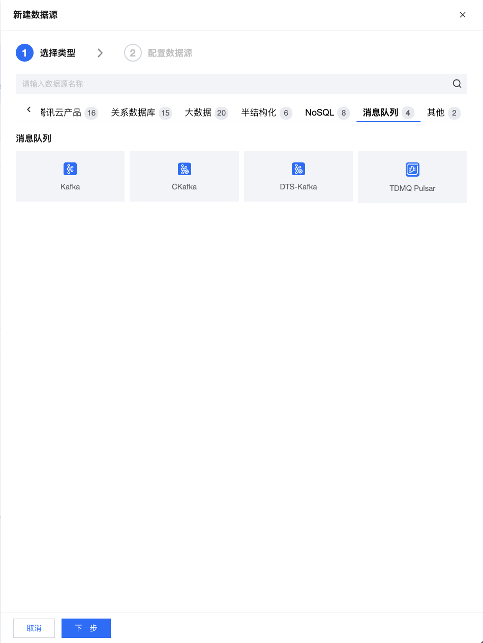 腾讯云 WeData 当前版本支持的消息队列类型数据源包括腾讯云 CKafka、DTS-Kafka、Kafka、TDMQ Pulsar 四种,其中 CKafka、DTS-Kafka、TDMQ Pulsar 为腾讯云消息队列产品。
